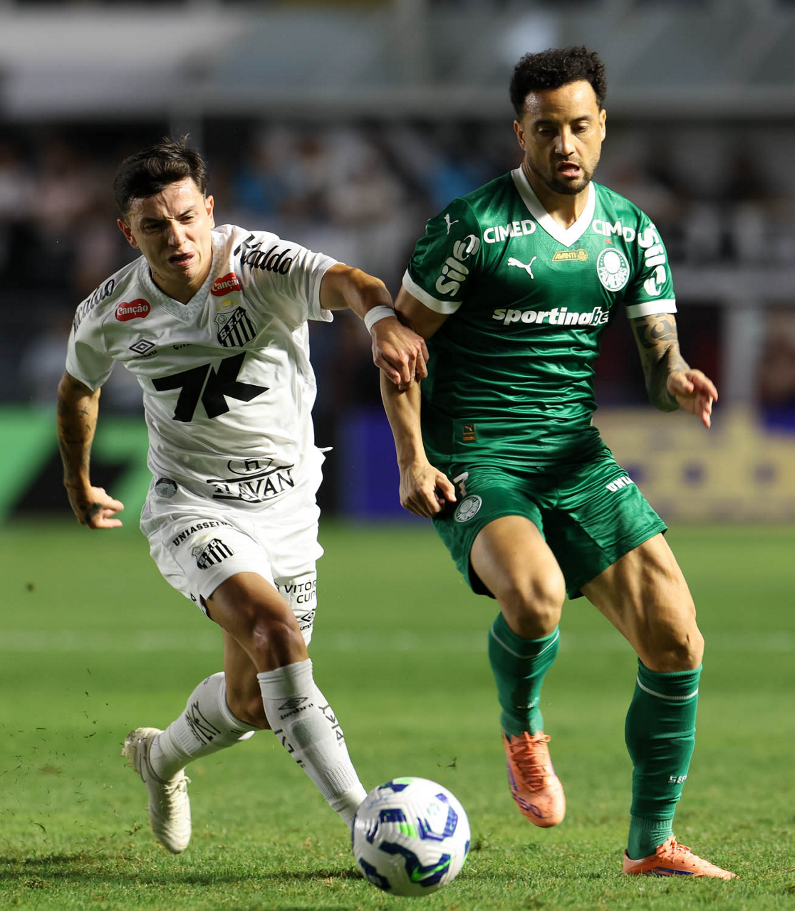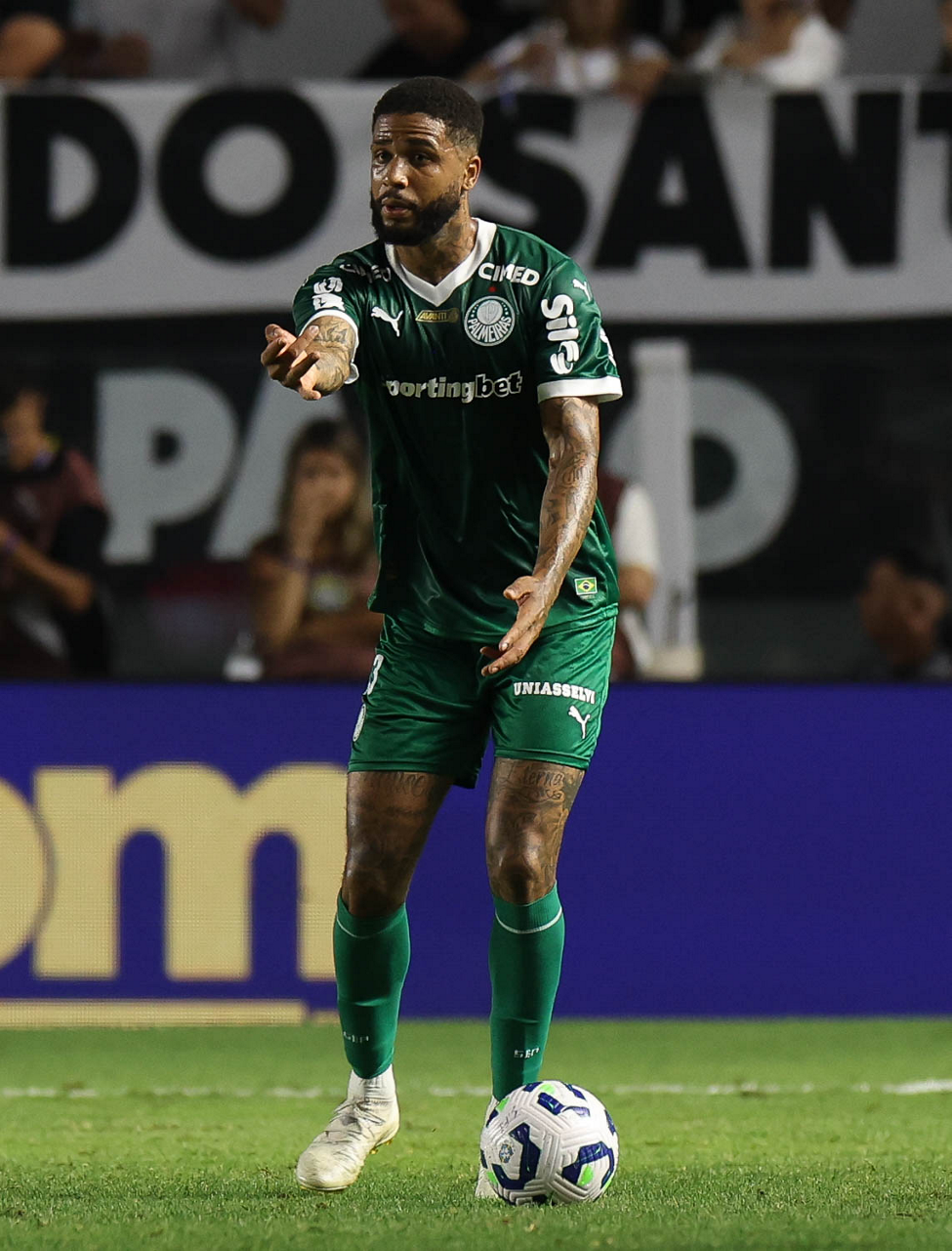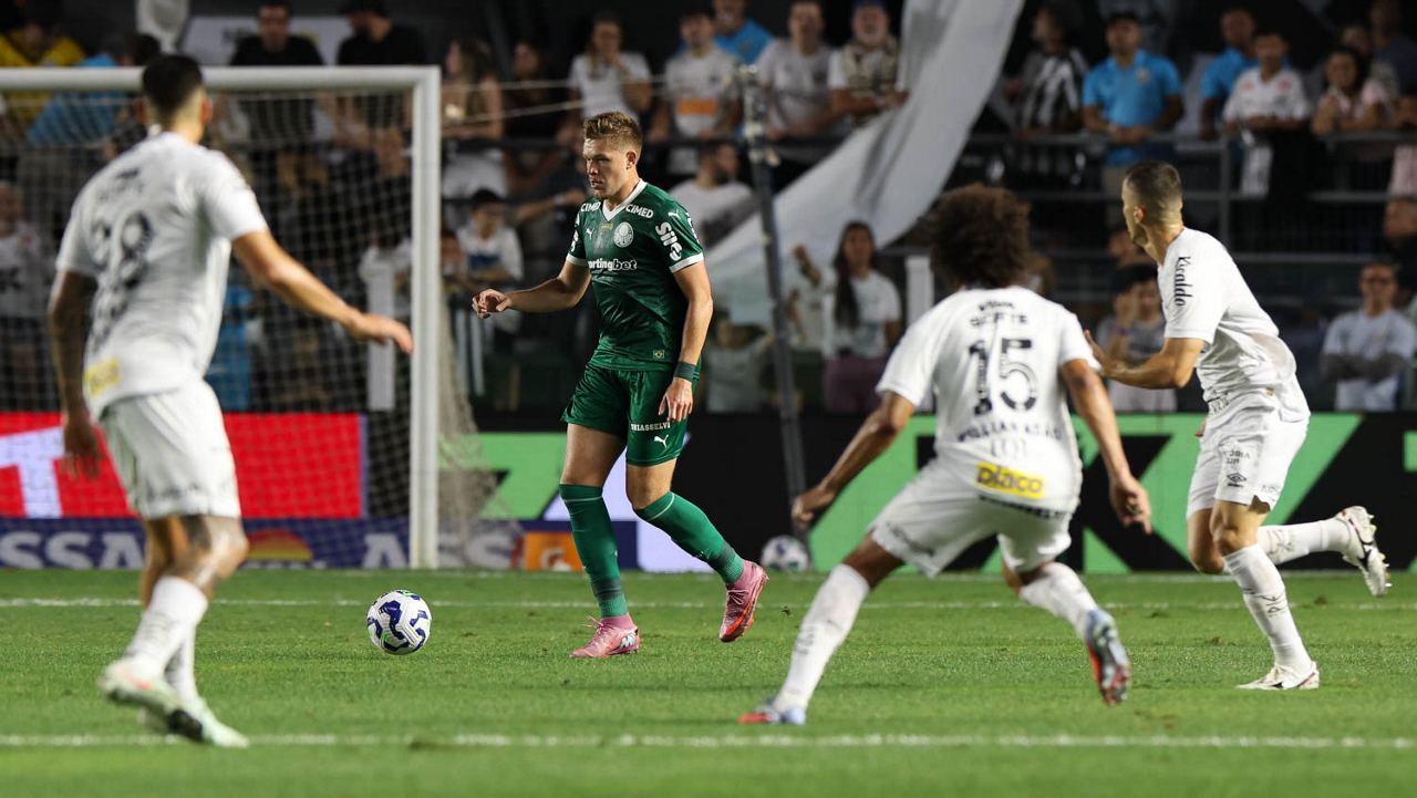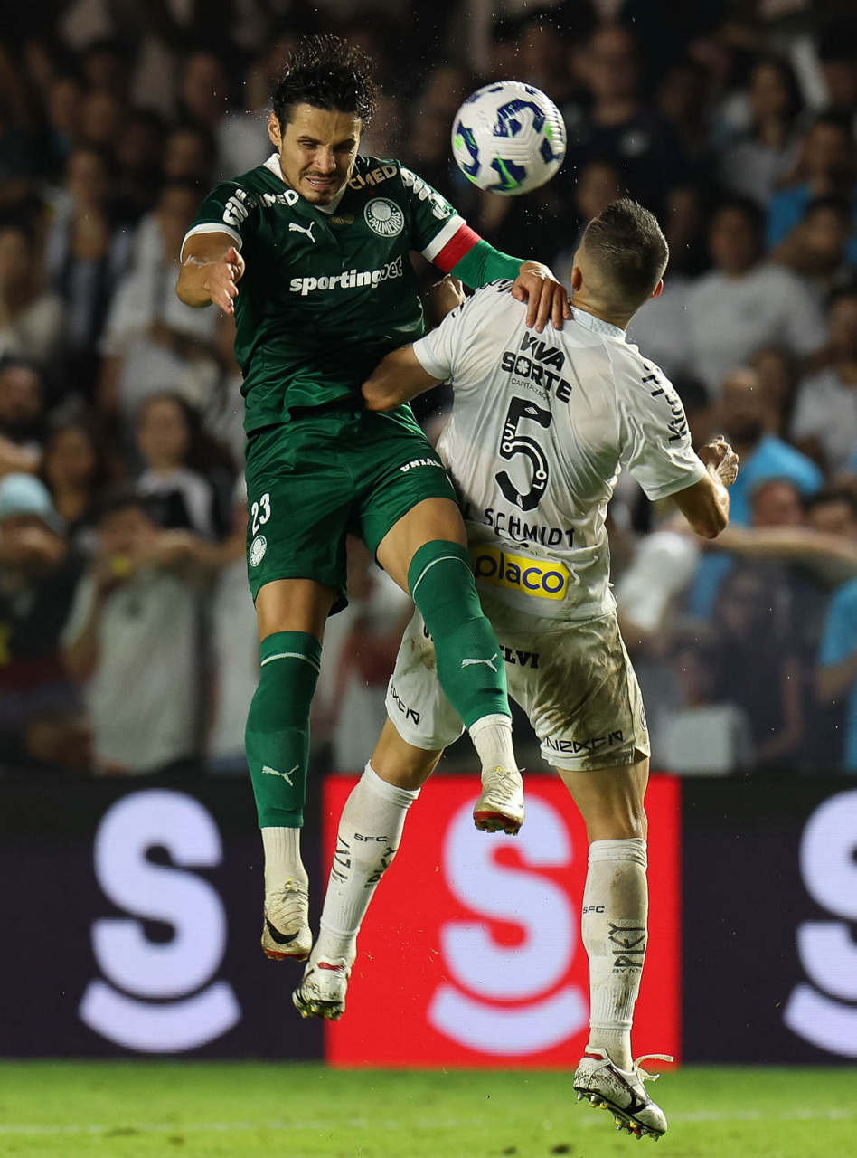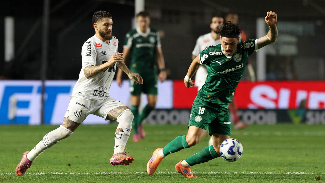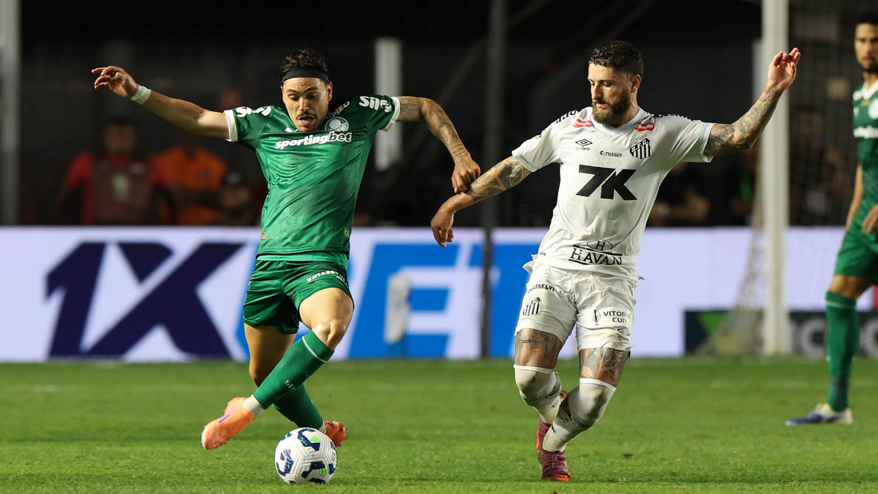 O técnico Abel Ferreira e o jogador Felipe Anderson (E), da SE Palmeiras, em jogo contra a equipe do Santos FC, durante partida válida pela décima terceira rodada, do Campeonato Brasileiro, Série A, no Estádio Vila Belmiro. (Foto: Cesar Greco/Palmeiras/by Canon)