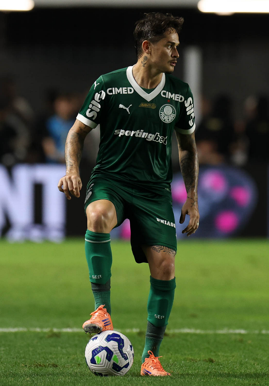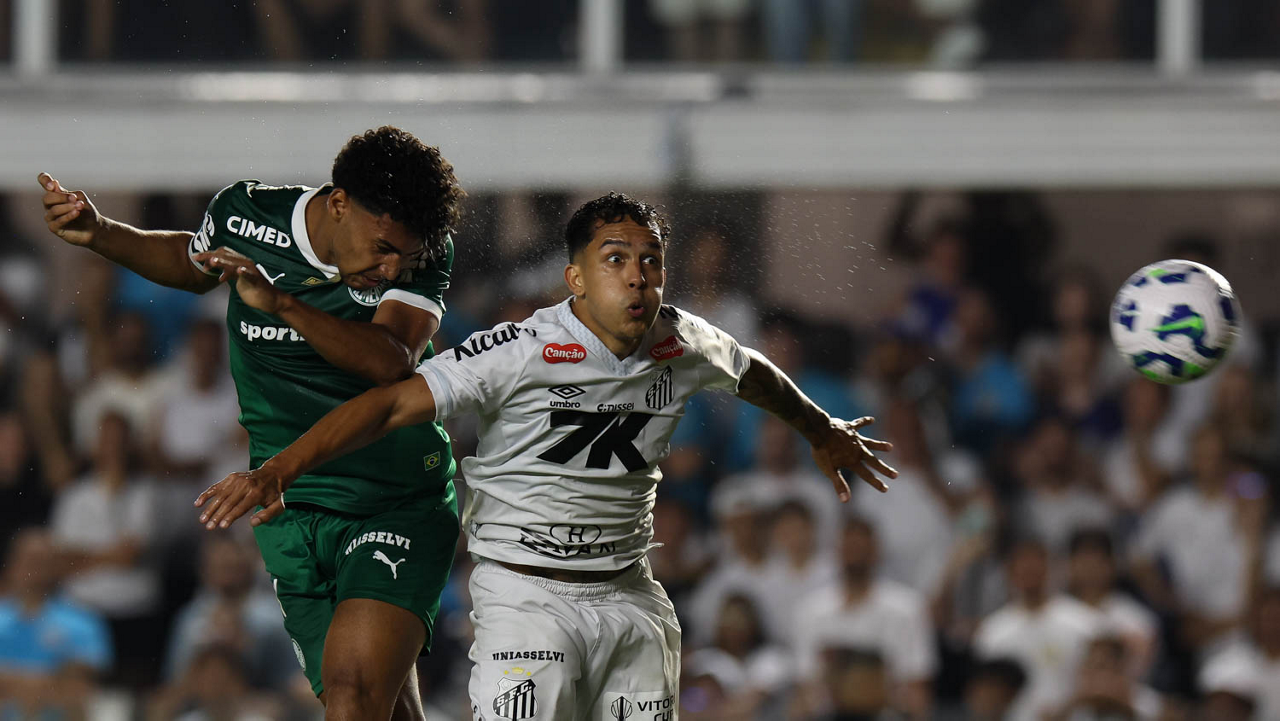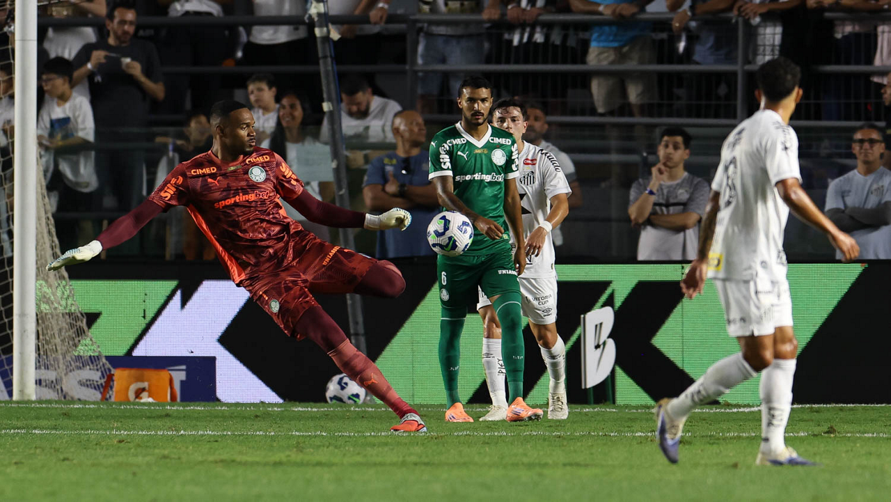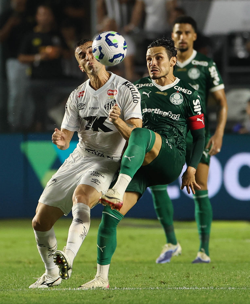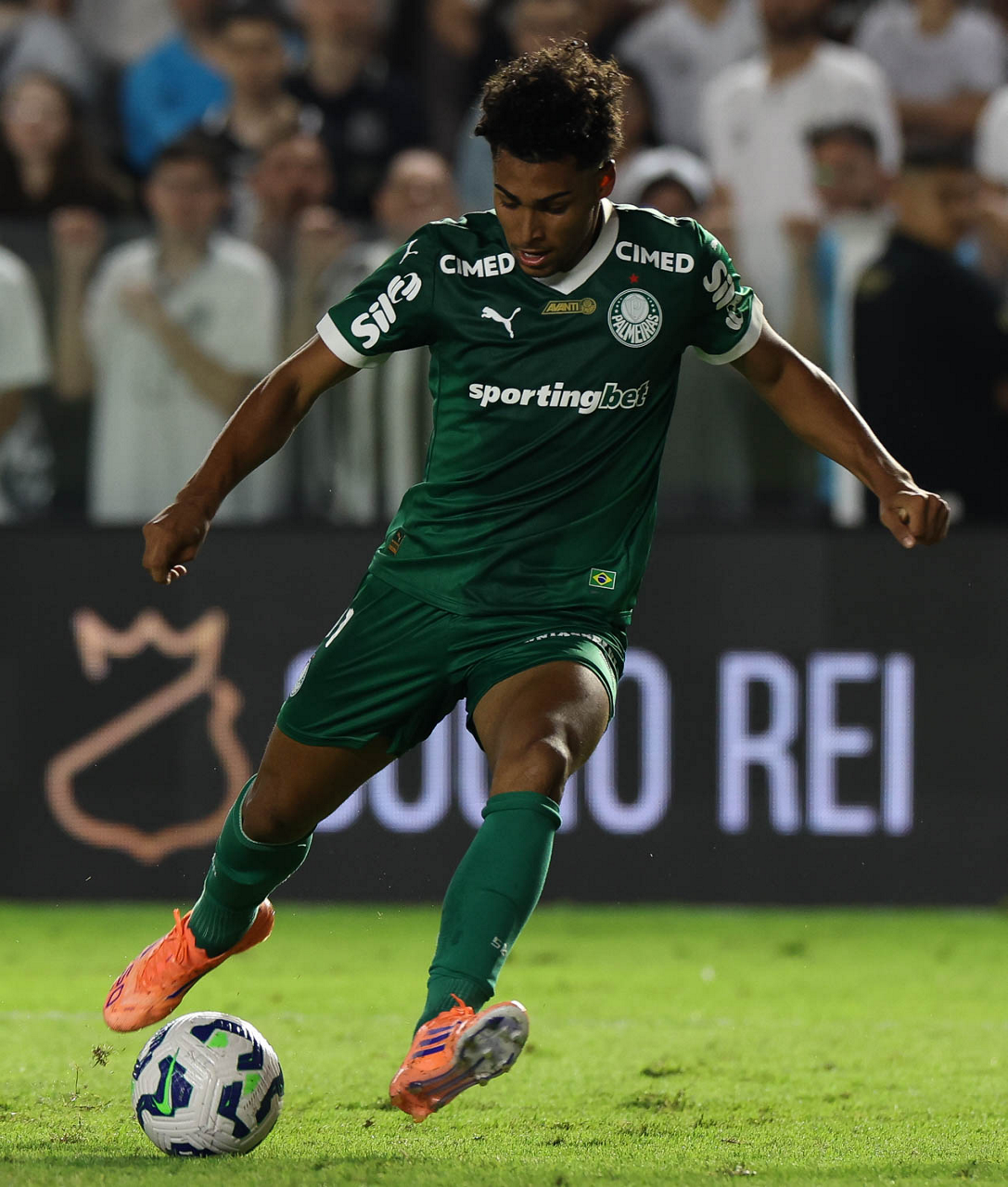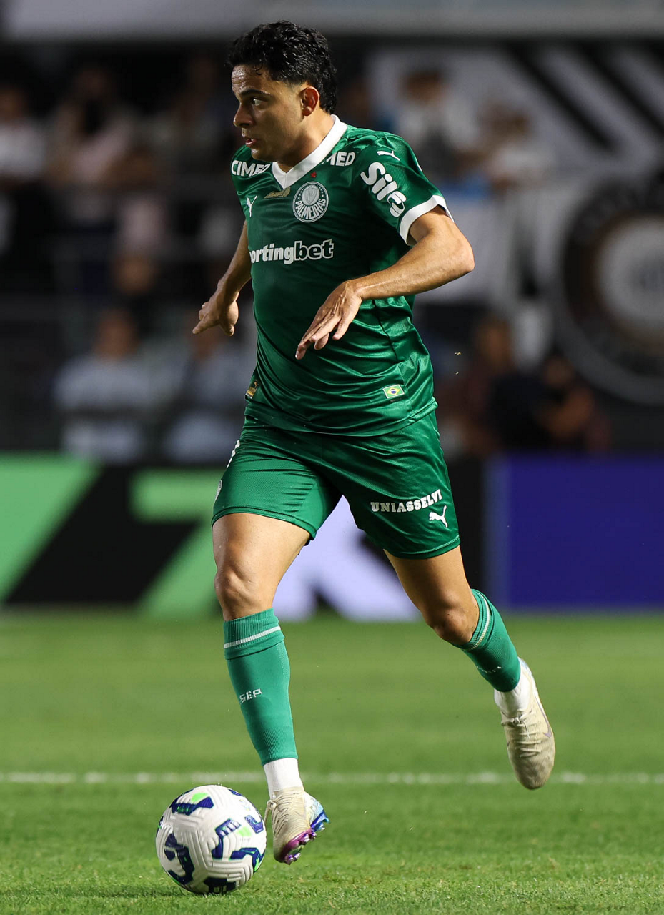 O técnico Abel Ferreira e o jogador Felipe Anderson (E), da SE Palmeiras, em jogo contra a equipe do Santos FC, durante partida válida pela décima terceira rodada, do Campeonato Brasileiro, Série A, no Estádio Vila Belmiro. (Foto: Cesar Greco/Palmeiras/by Canon)