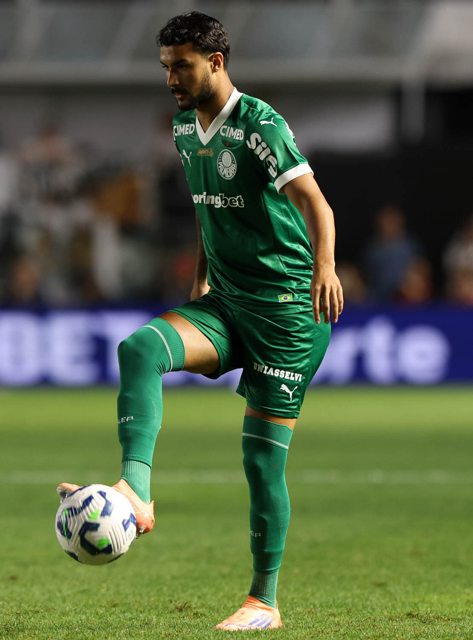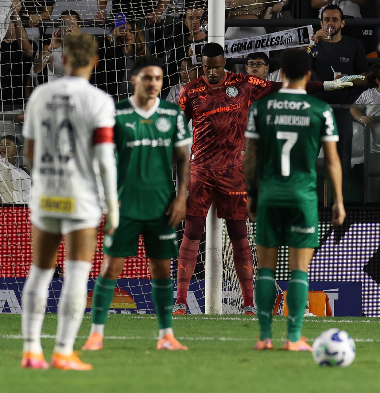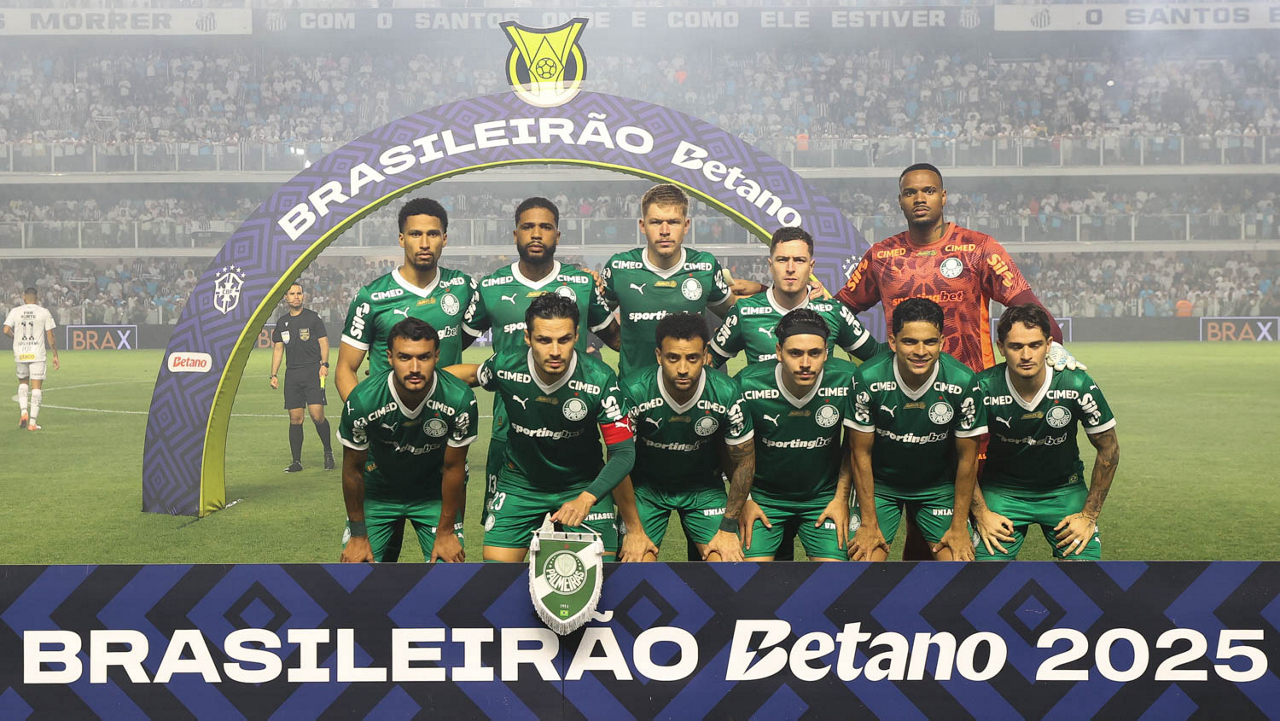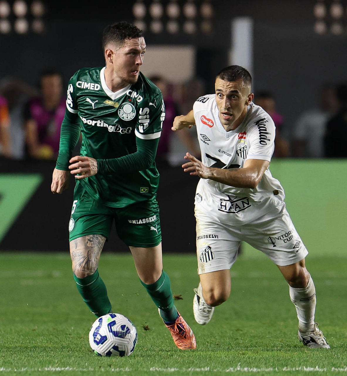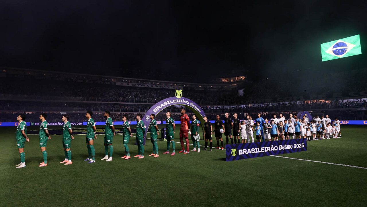 O técnico Abel Ferreira e o jogador Felipe Anderson (E), da SE Palmeiras, em jogo contra a equipe do Santos FC, durante partida válida pela décima terceira rodada, do Campeonato Brasileiro, Série A, no Estádio Vila Belmiro. (Foto: Cesar Greco/Palmeiras/by Canon)