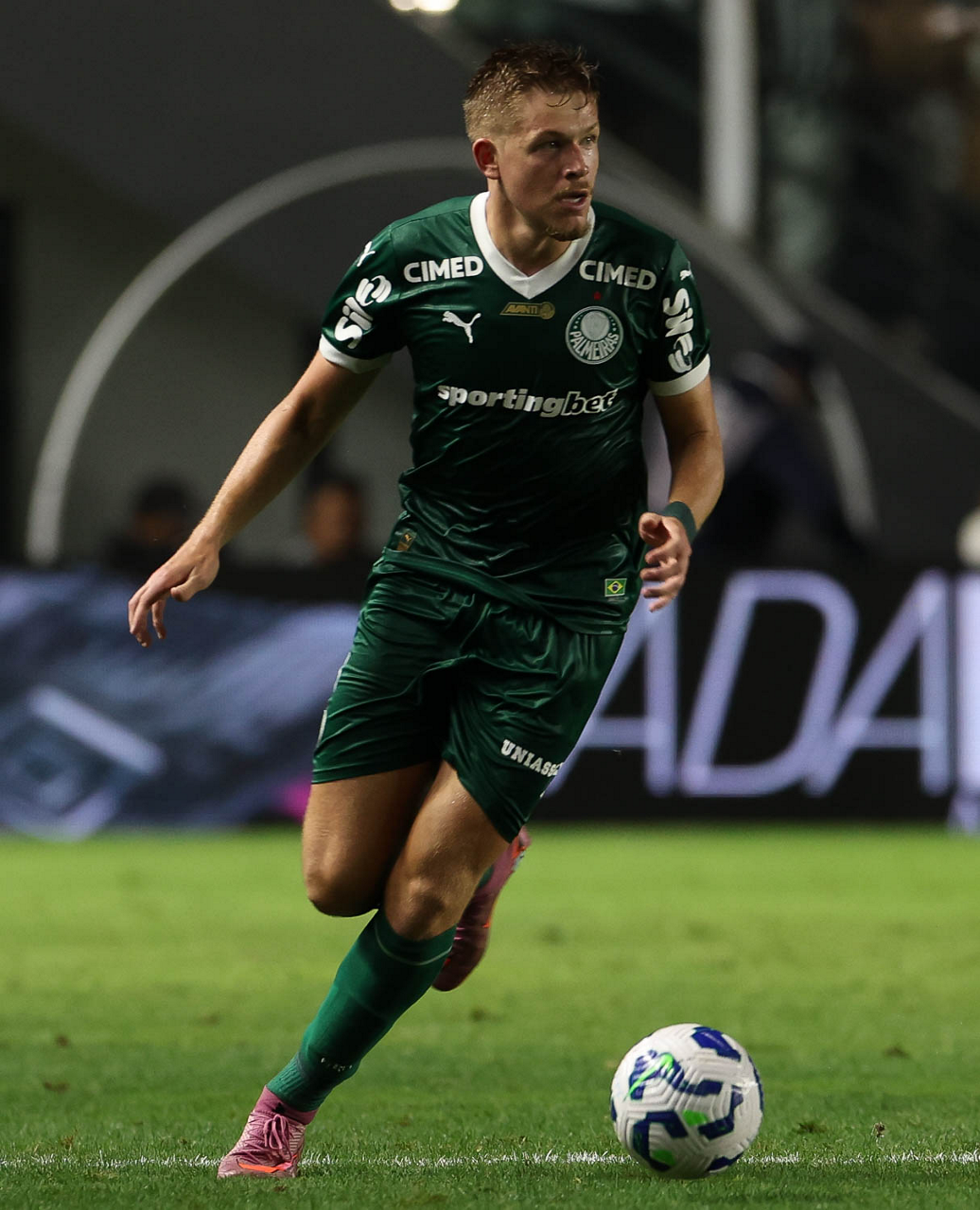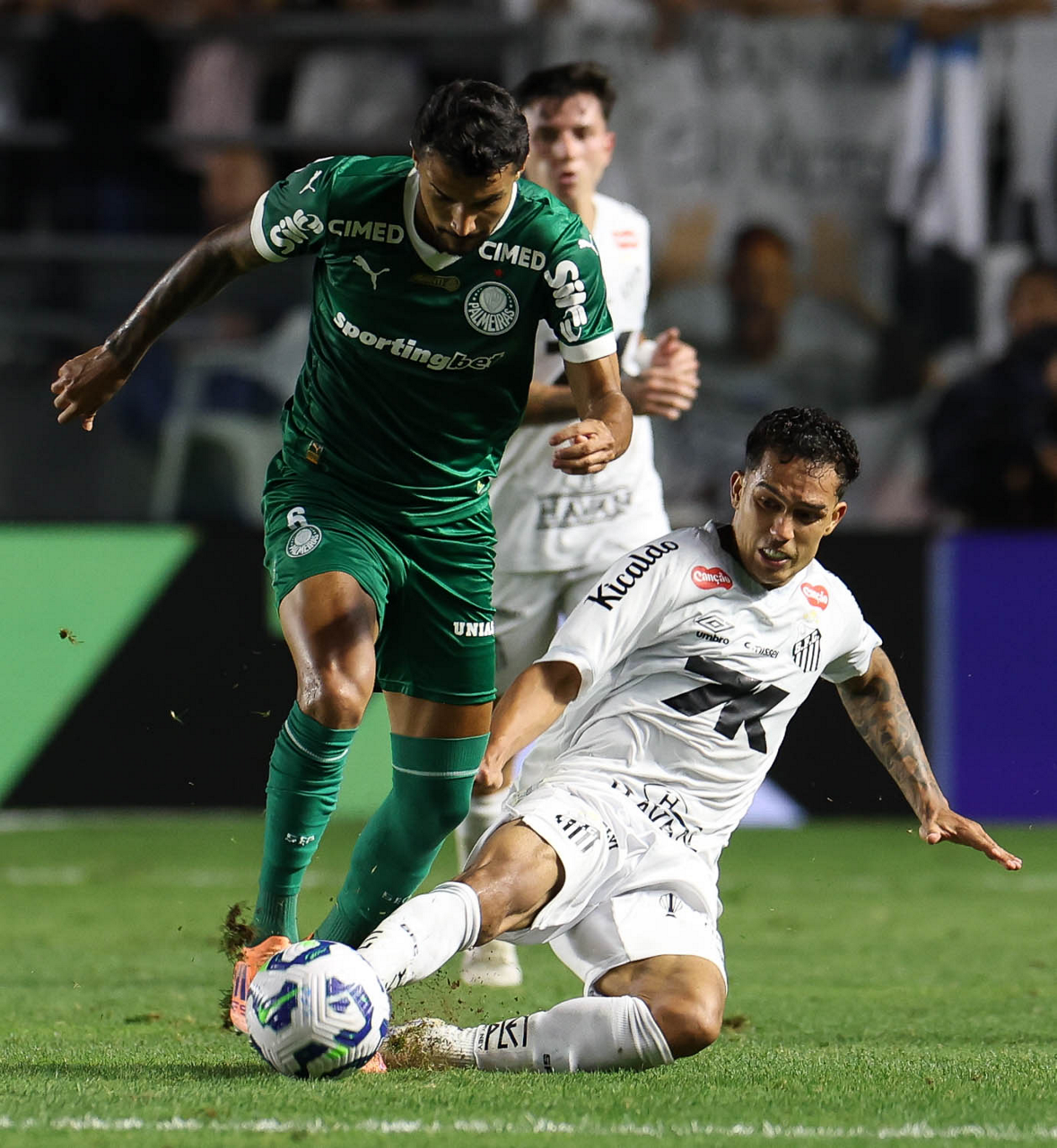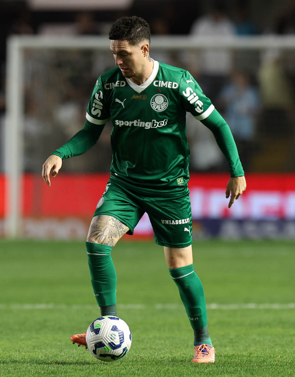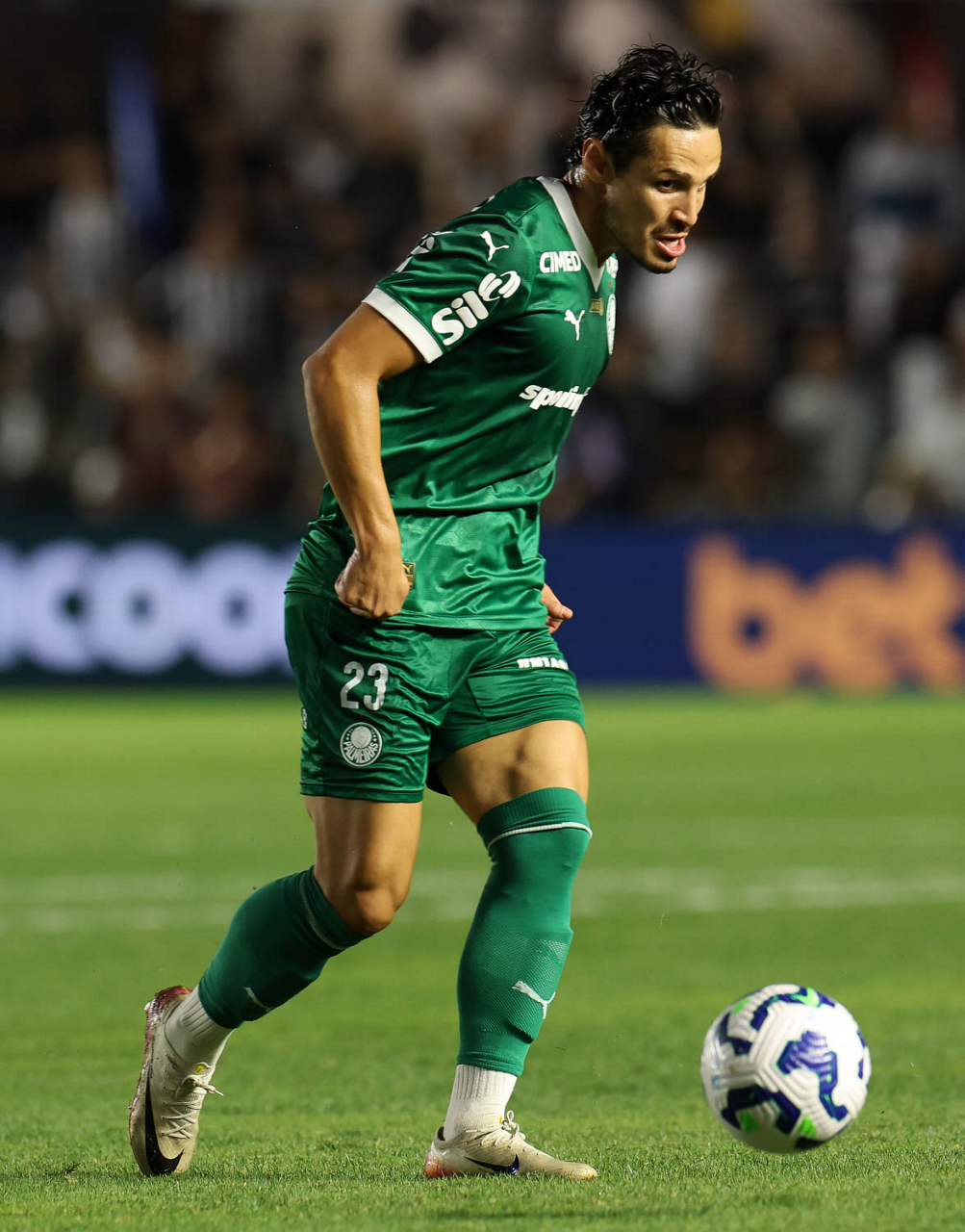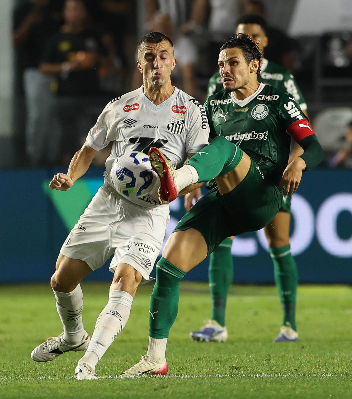 O técnico Abel Ferreira e o jogador Felipe Anderson (E), da SE Palmeiras, em jogo contra a equipe do Santos FC, durante partida válida pela décima terceira rodada, do Campeonato Brasileiro, Série A, no Estádio Vila Belmiro. (Foto: Cesar Greco/Palmeiras/by Canon)