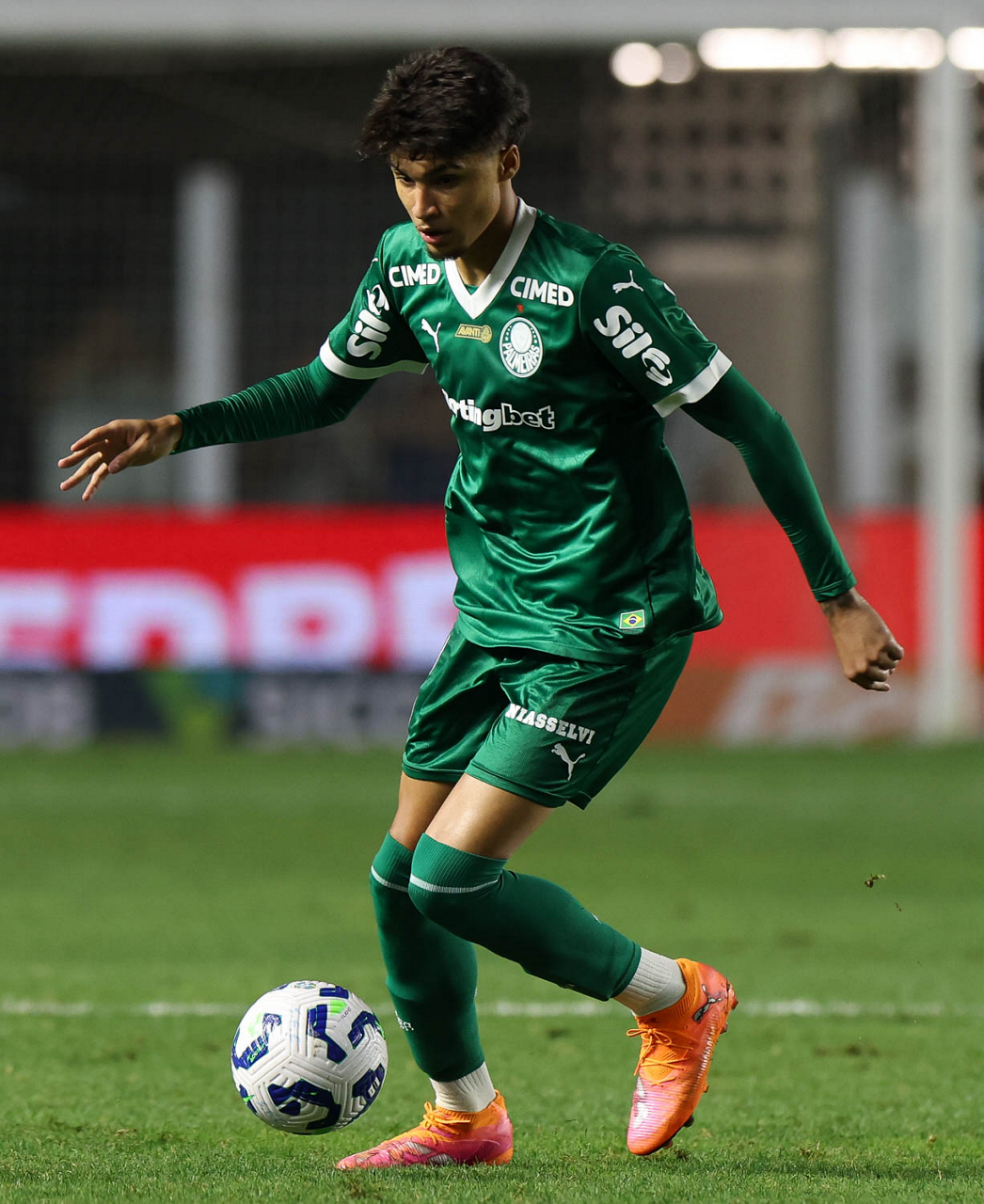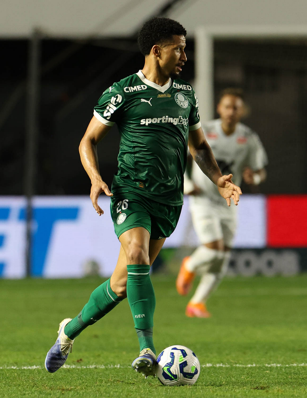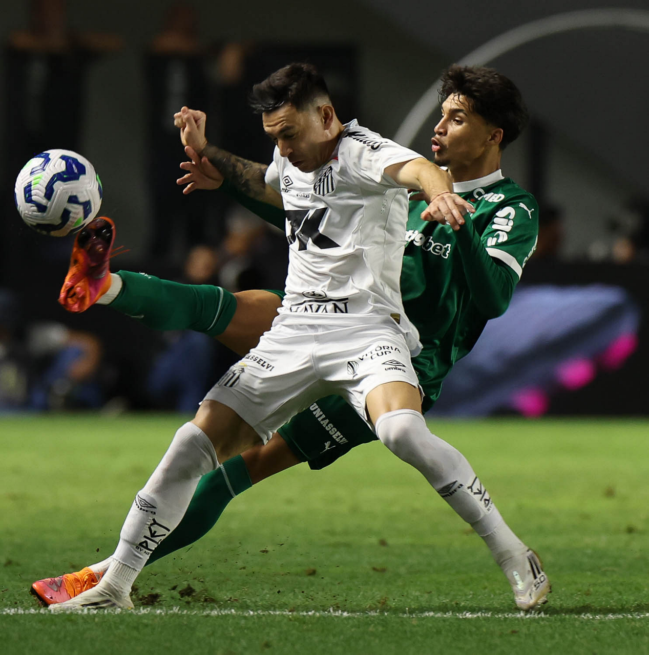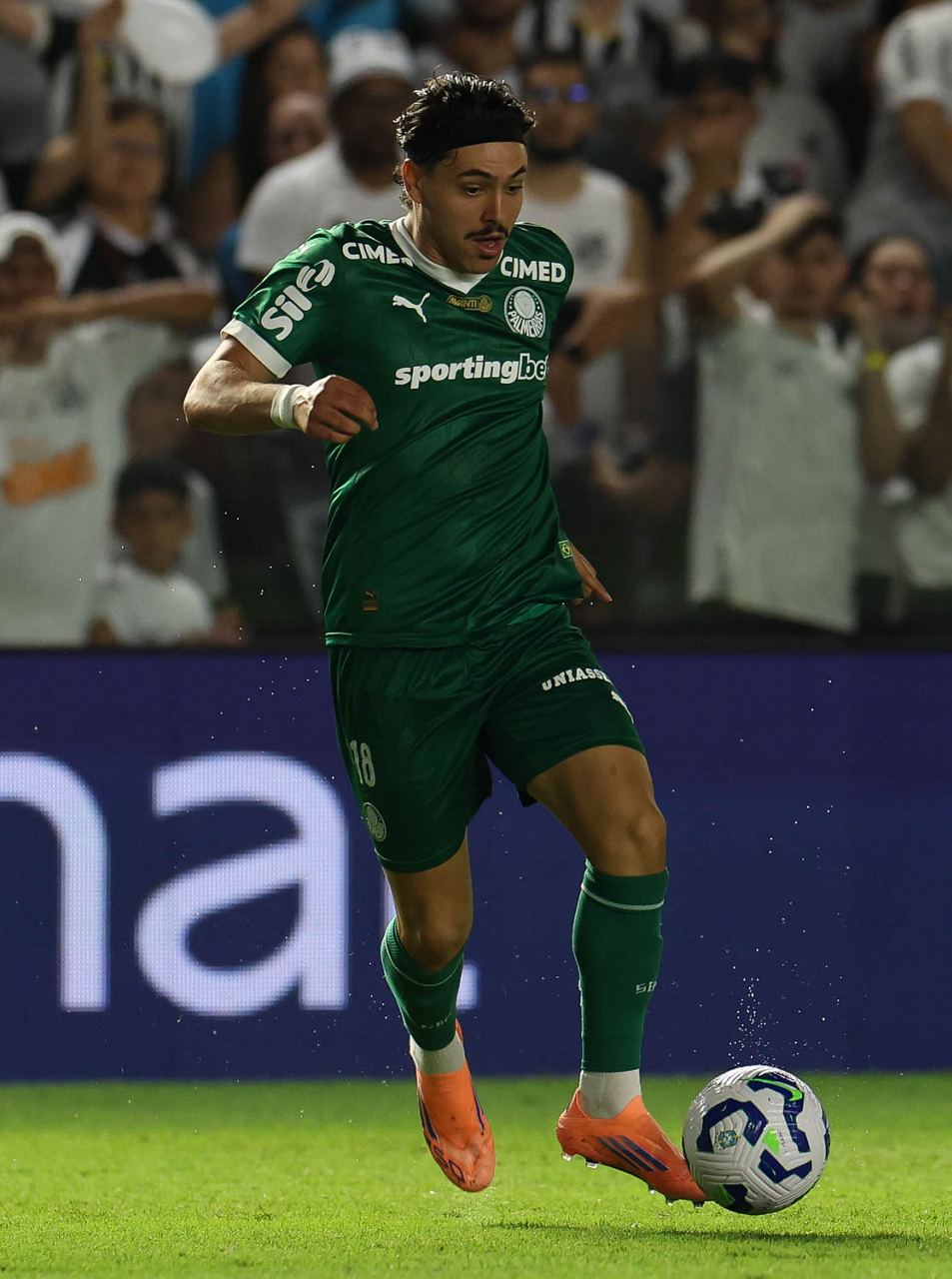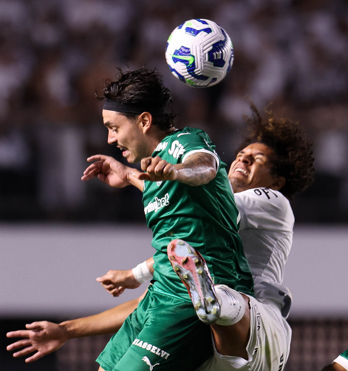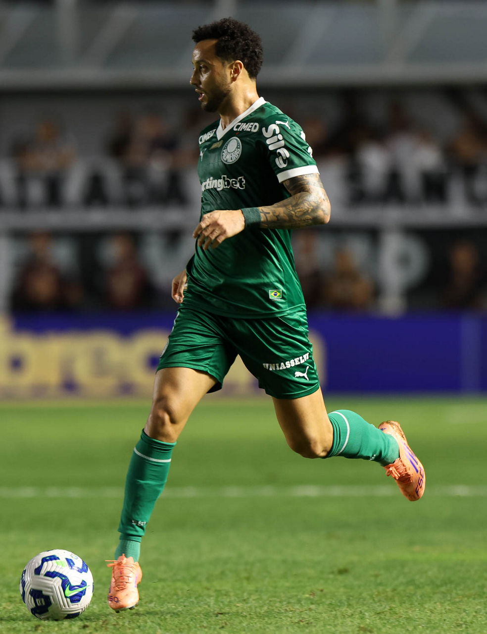 O técnico Abel Ferreira e o jogador Felipe Anderson (E), da SE Palmeiras, em jogo contra a equipe do Santos FC, durante partida válida pela décima terceira rodada, do Campeonato Brasileiro, Série A, no Estádio Vila Belmiro. (Foto: Cesar Greco/Palmeiras/by Canon)