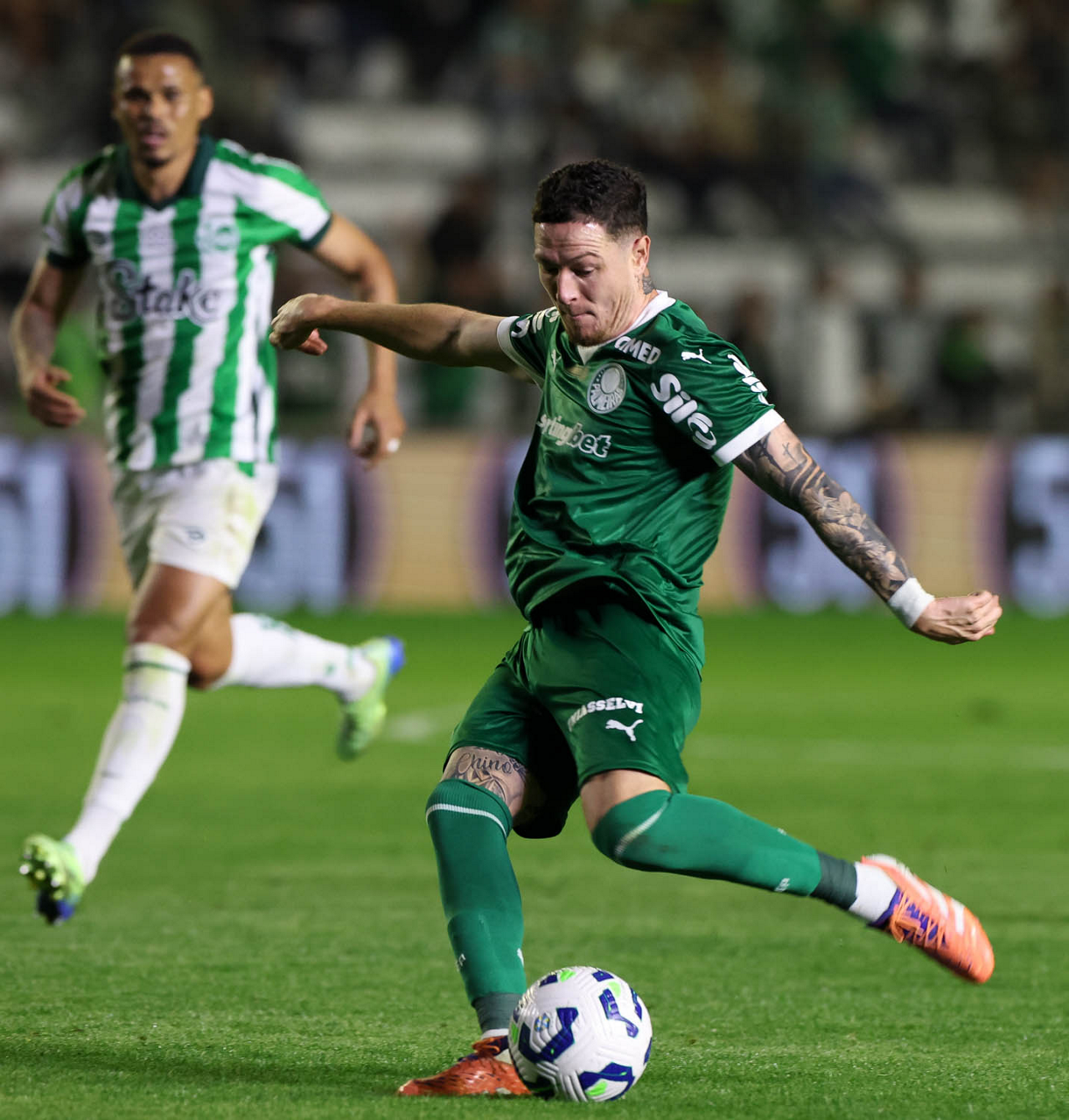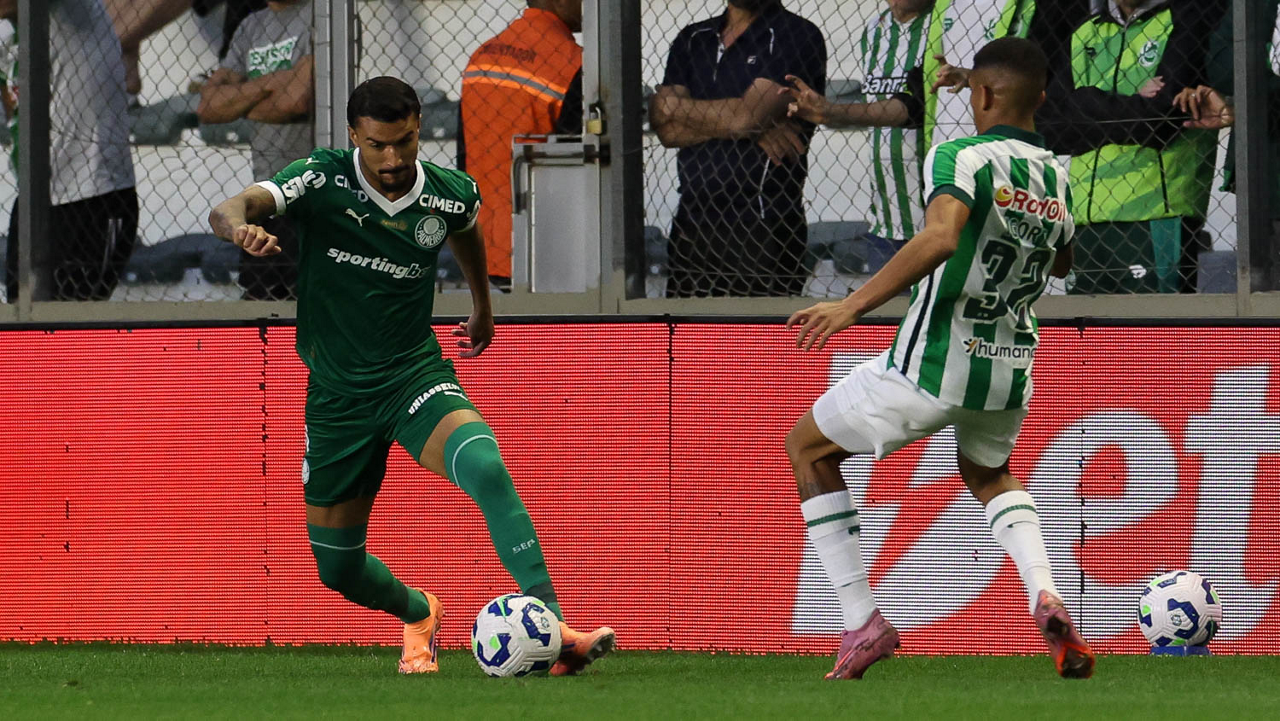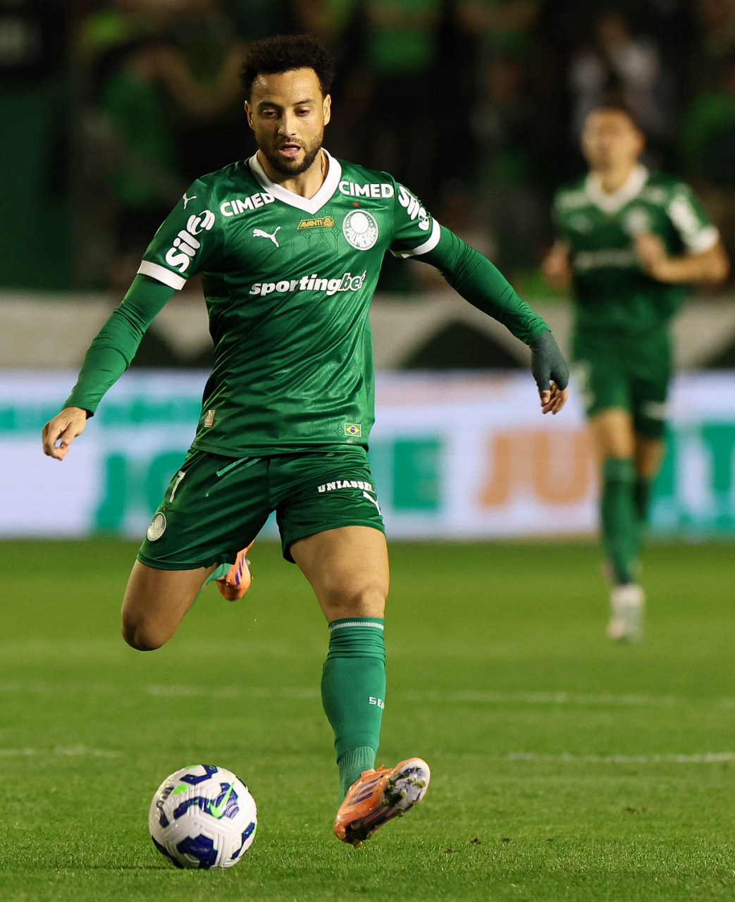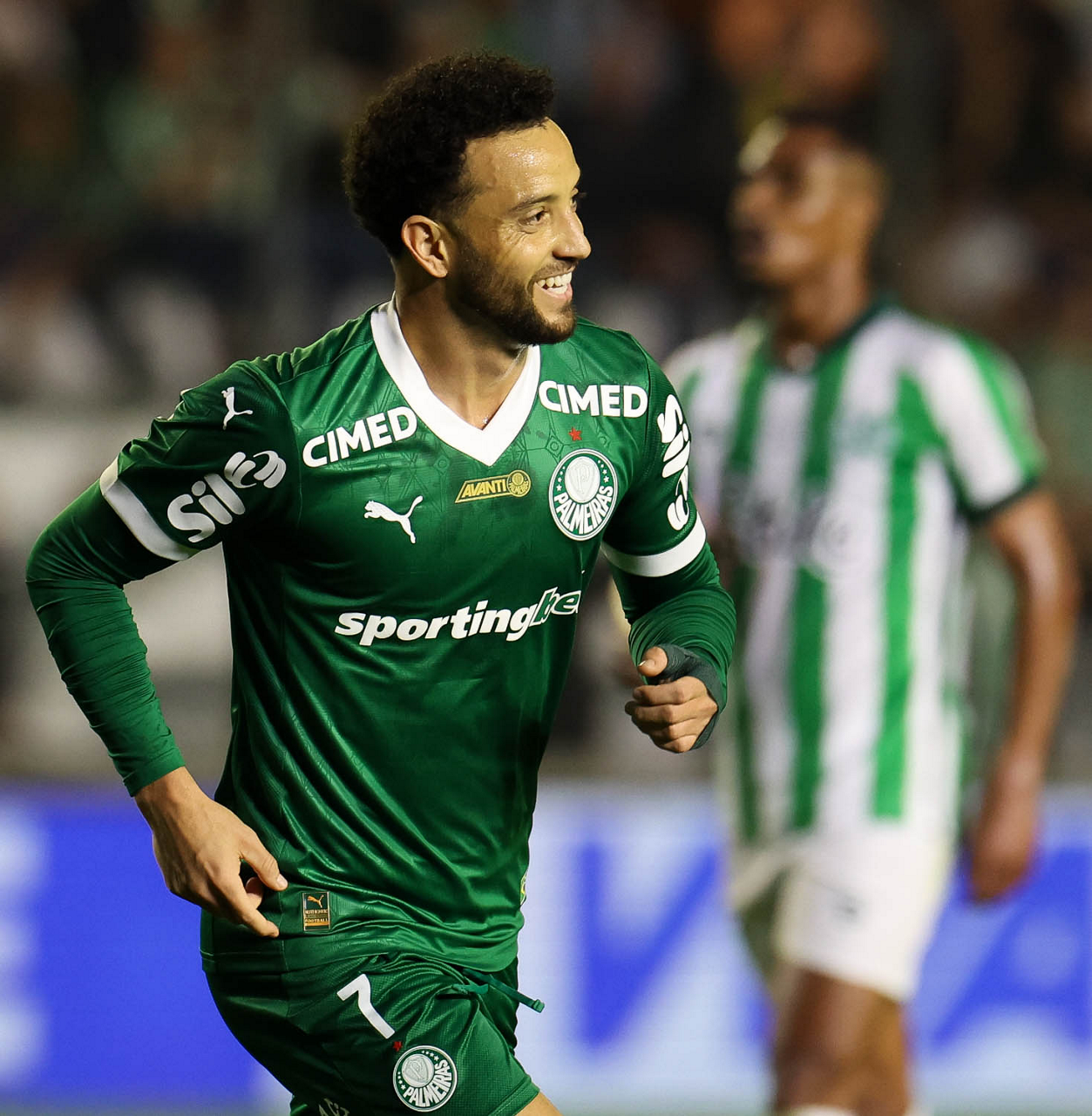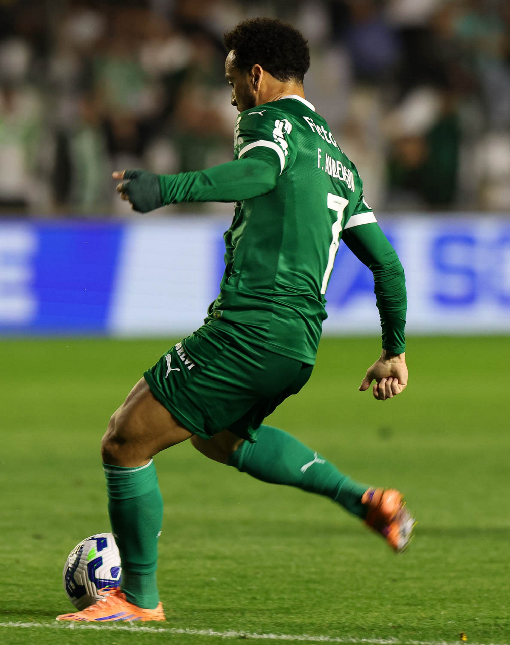 O jogador Felipe Anderson, da SE Palmeiras, chuta para marcar seu gol contra a equipe do EC Juventude, durante partida válida pela trigésima primeira rodada, do Campeonato Brasileiro, Série A, no Estádio Alfredo Jaconi. (Foto: Cesar Greco/Palmeiras/by Canon)