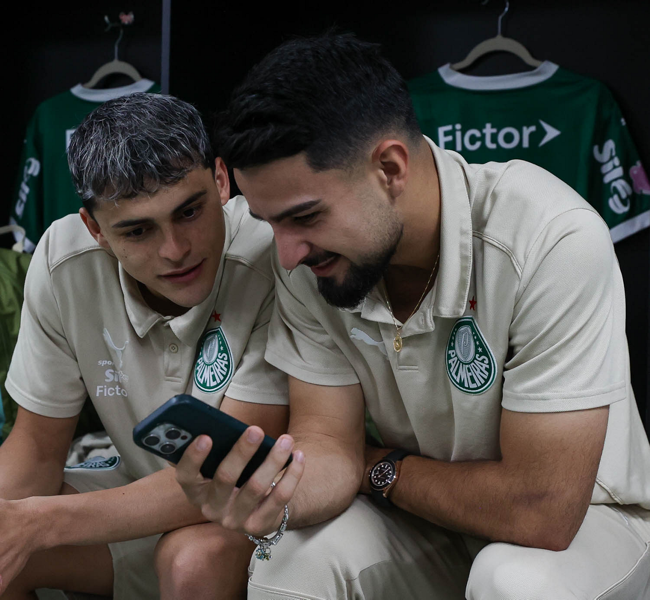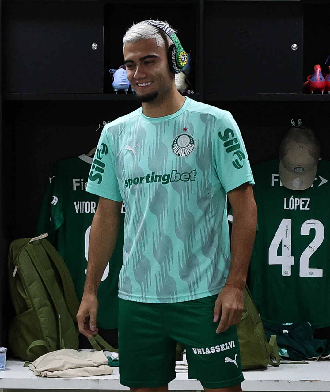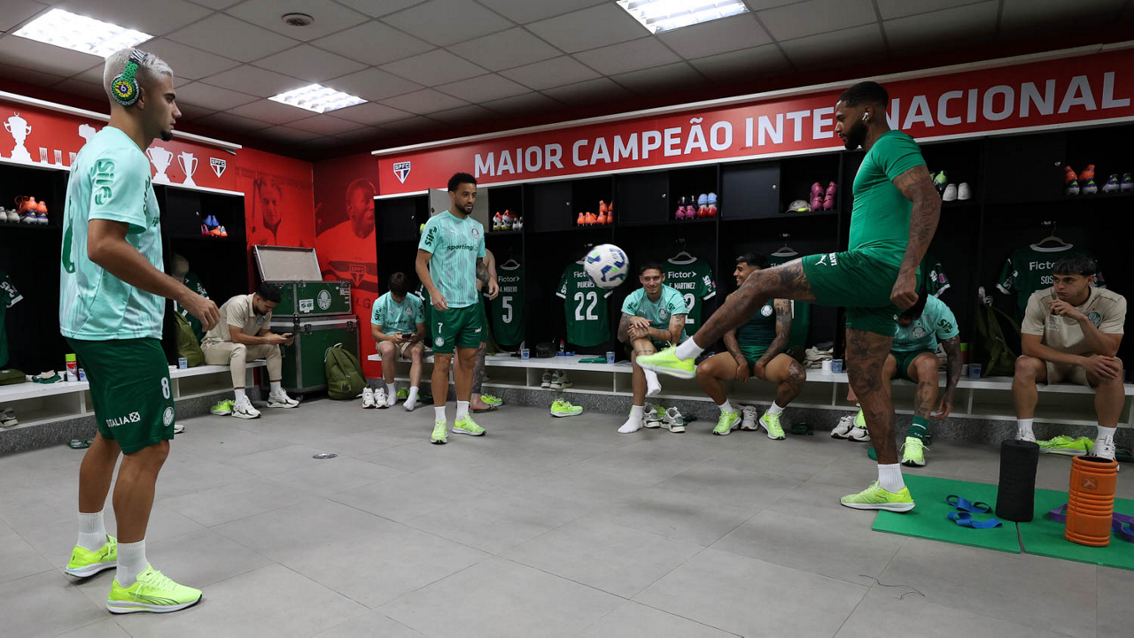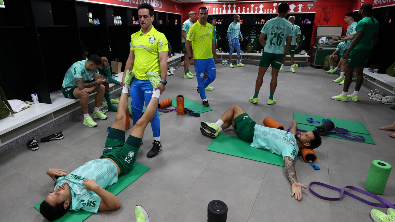 O fisioterapeuta Marcelo Gondo, o técnico em enfermagem Daniel Lima e o jogador Agustín Giay (E/D), da SE Palmeiras, preparam-se para o jogo contra a equipe do São Paulo FC, durante partida válida pela vigésima sétima rodada, do Campeonato Brasileiro, Série A, no Estádio Morumbis. (Foto: Cesar Greco/Palmeiras/by Canon)