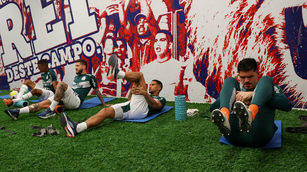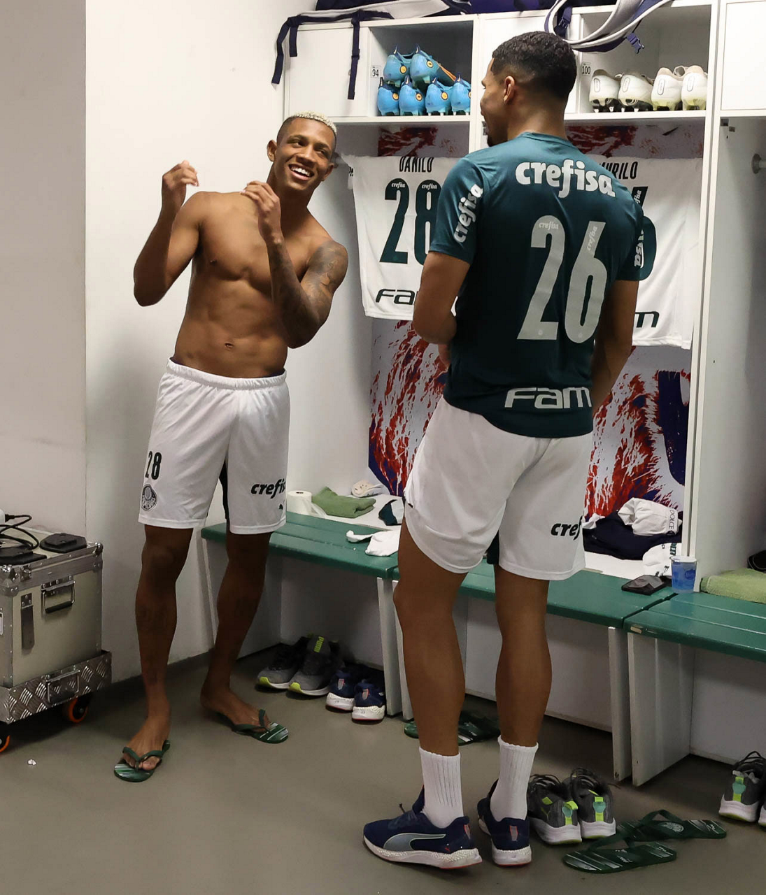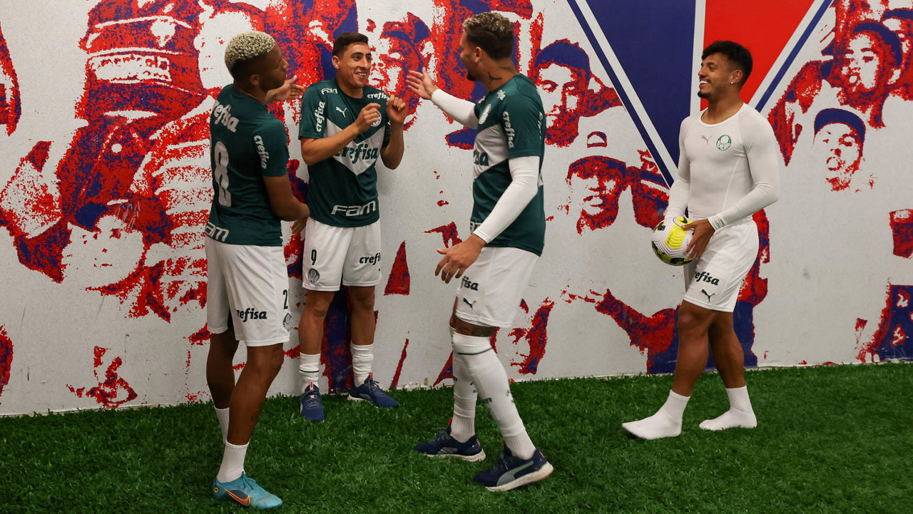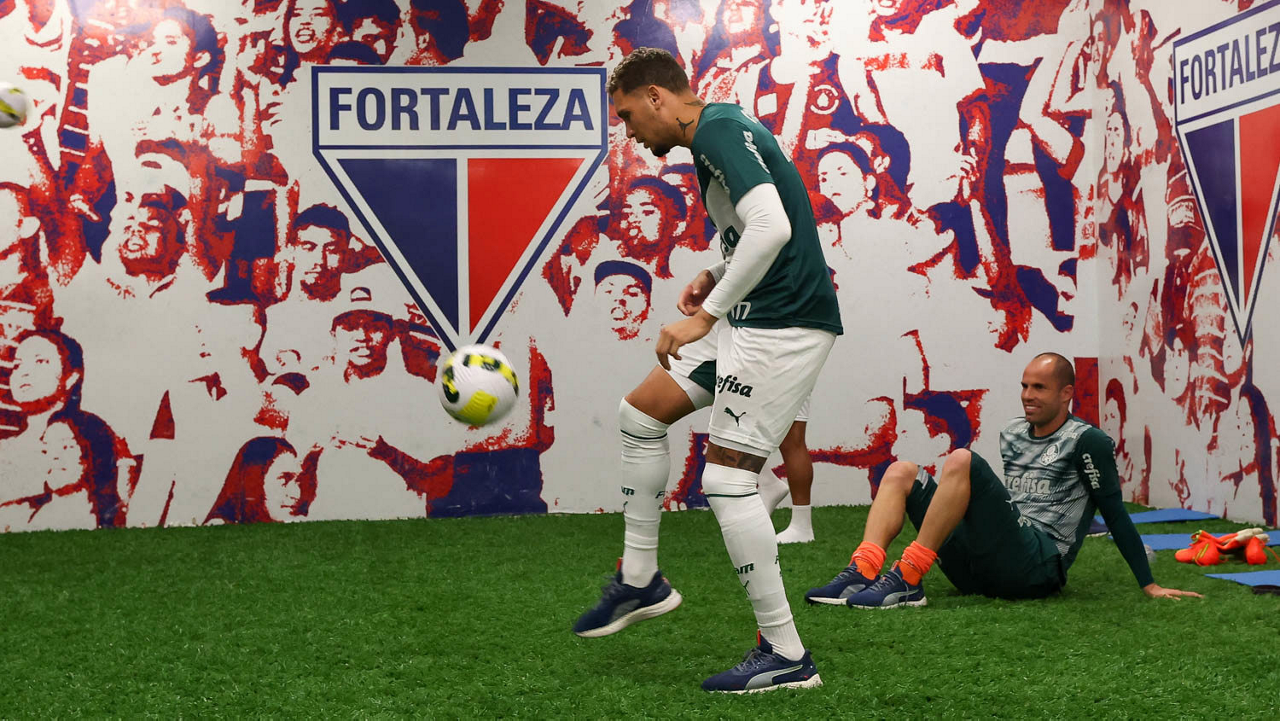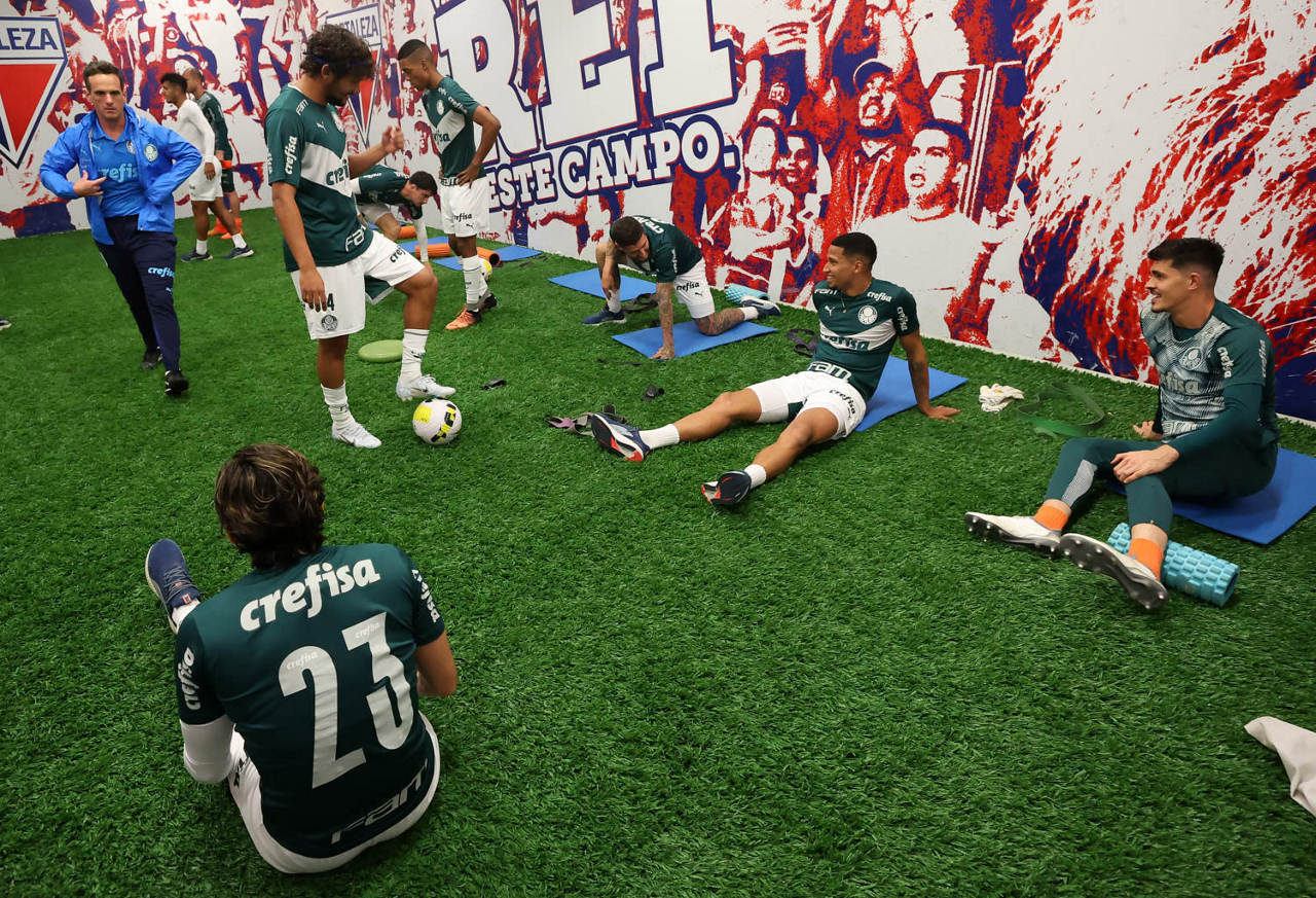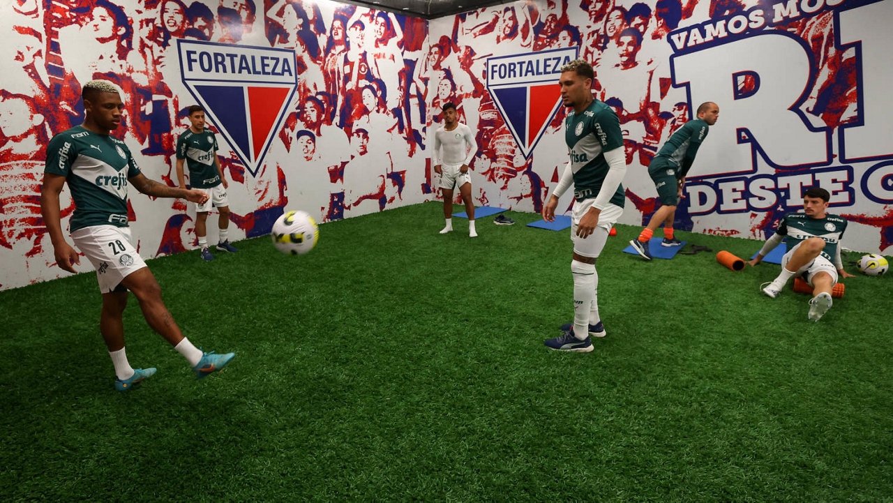 Os jogadores Danilo, Miguel Merentiel, Rafael Navarro e Gabriel Menino (E/D), da SE Palmeiras, preparam-se para o jogo contra a equipe do Ceará SC, durante partida válida pela vigésima rodada, do Campeonato Brasileiro, Série A, na Arena Castelão. (Foto: Cesar Greco)