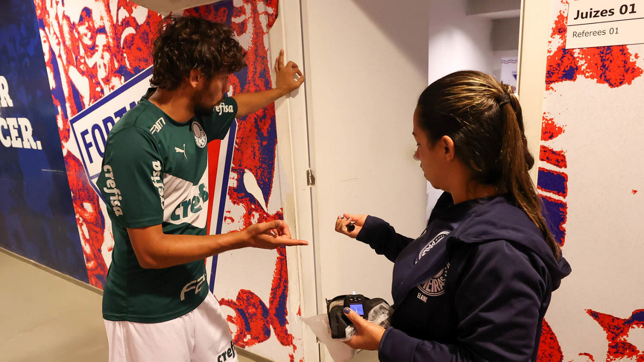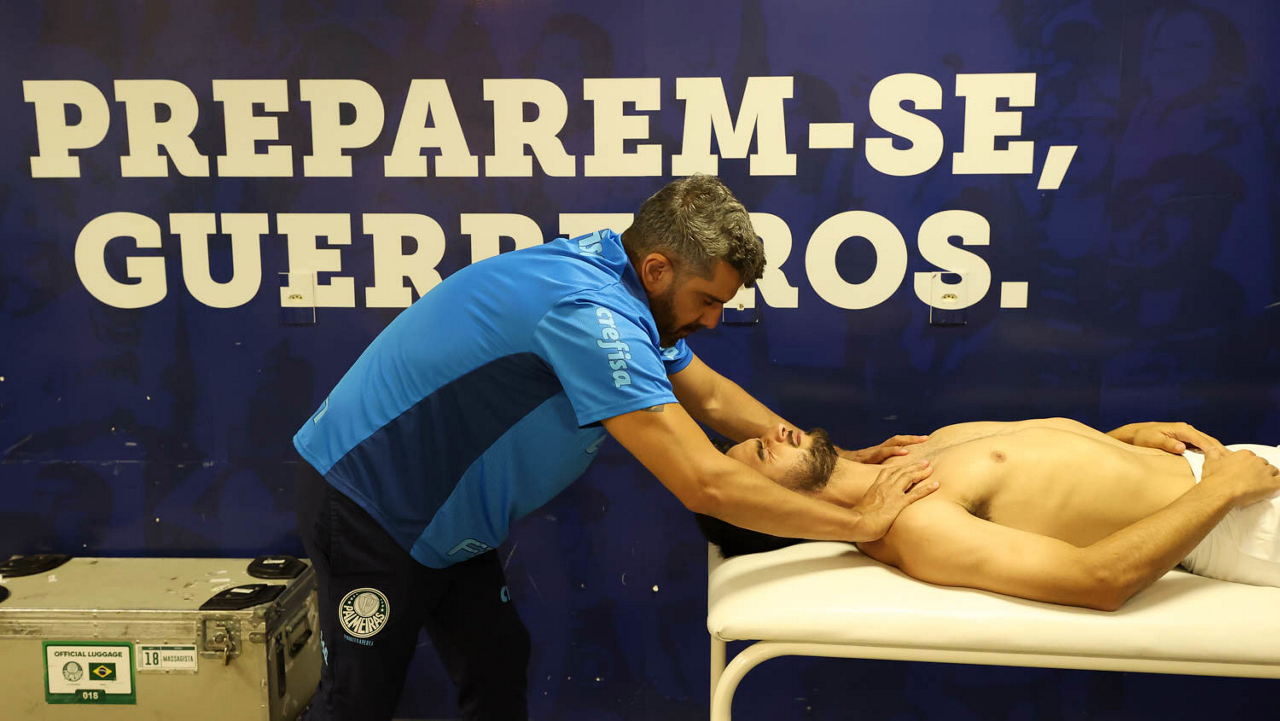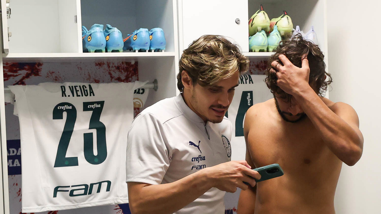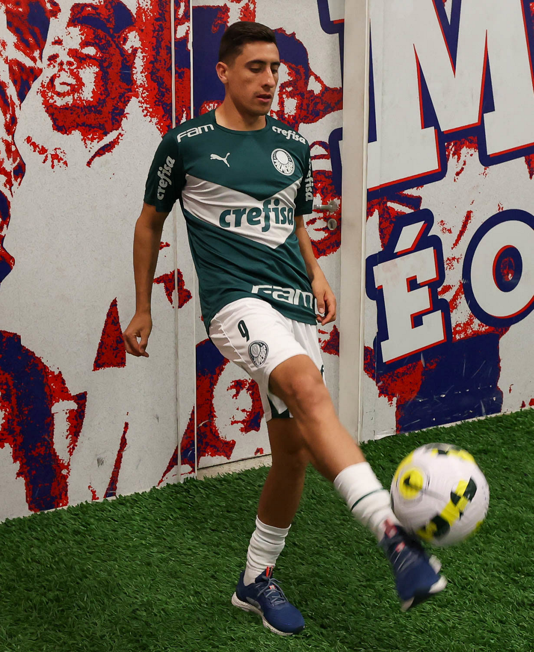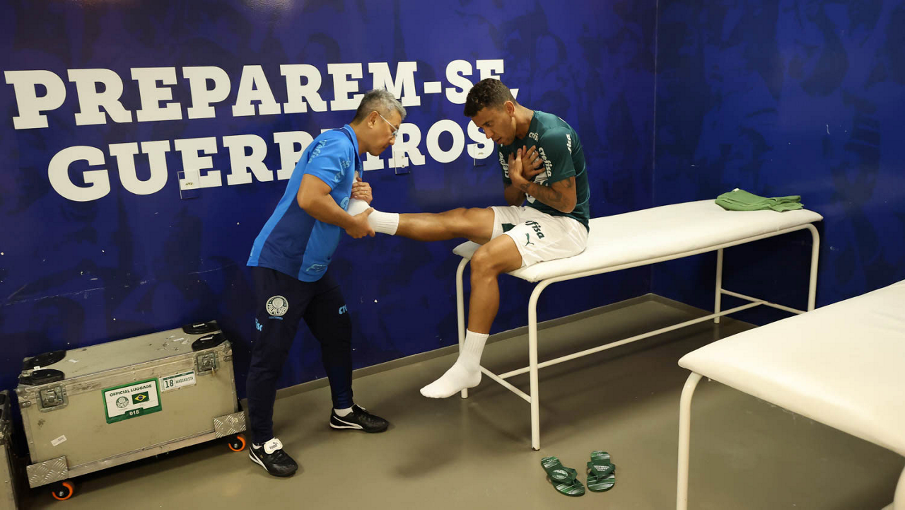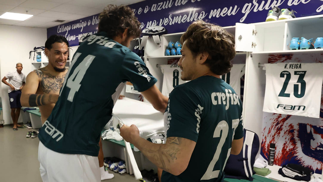 Os jogadores Danilo, Miguel Merentiel, Rafael Navarro e Gabriel Menino (E/D), da SE Palmeiras, preparam-se para o jogo contra a equipe do Ceará SC, durante partida válida pela vigésima rodada, do Campeonato Brasileiro, Série A, na Arena Castelão. (Foto: Cesar Greco)