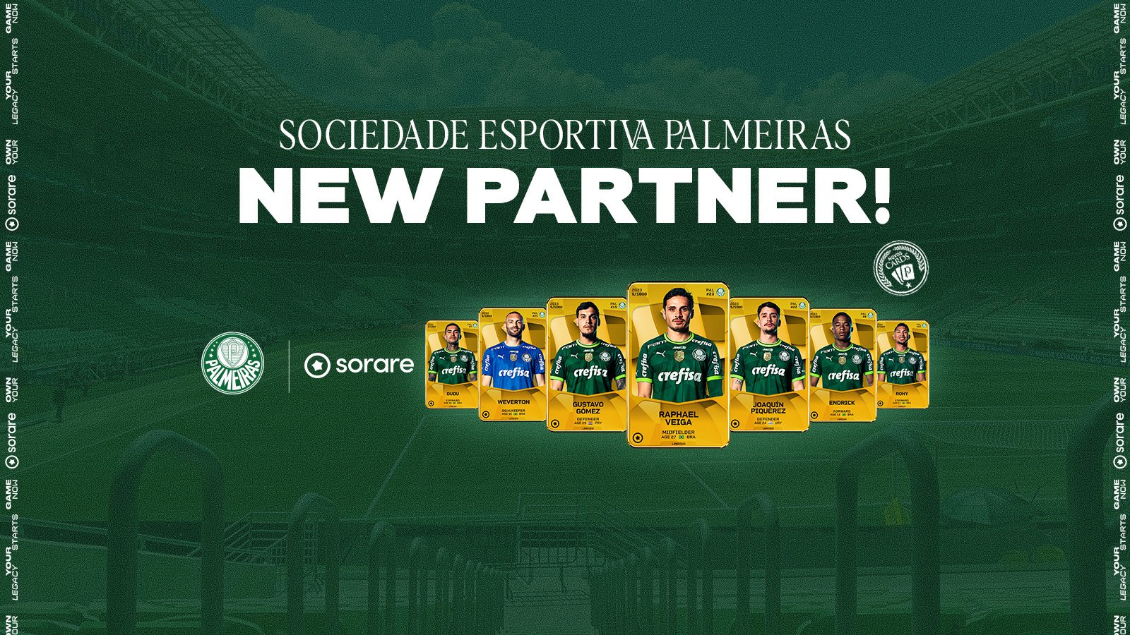 O Palmeiras e a Sorare, empresa global de entretenimento esportivo, anunciam nesta terça-feira (31) uma parceria que disponibilizará cards digitais exclusivos dos atuais jogadores do Verdão, como Gustavo Gómez, Raphael Veiga, Endrick, Dudu, Rony, entre outros. Para ter acesso a esta novidade, é muito simples. Basta o torcedor criar uma conta no site sorare.com e pronto. Na mesma hora já poderá garantir os cards palestrinos e montar a sua equipe para competir no fantasy game, tornando os cards mais valiosos conforme o seu desempenho.