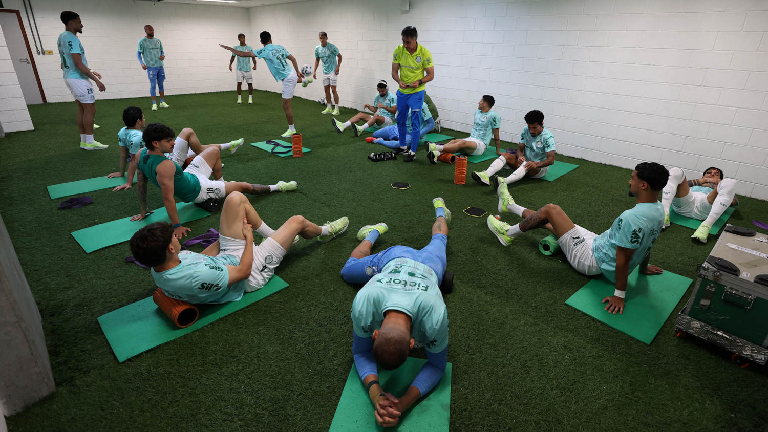 Pendurados: Weverton, Gustavo Gómez, Micael, Piquerez, Martínez, Lucas Evangelista, Facundo Torres, Vitor Roque e Vitor Castanheira (auxiliar técnico)