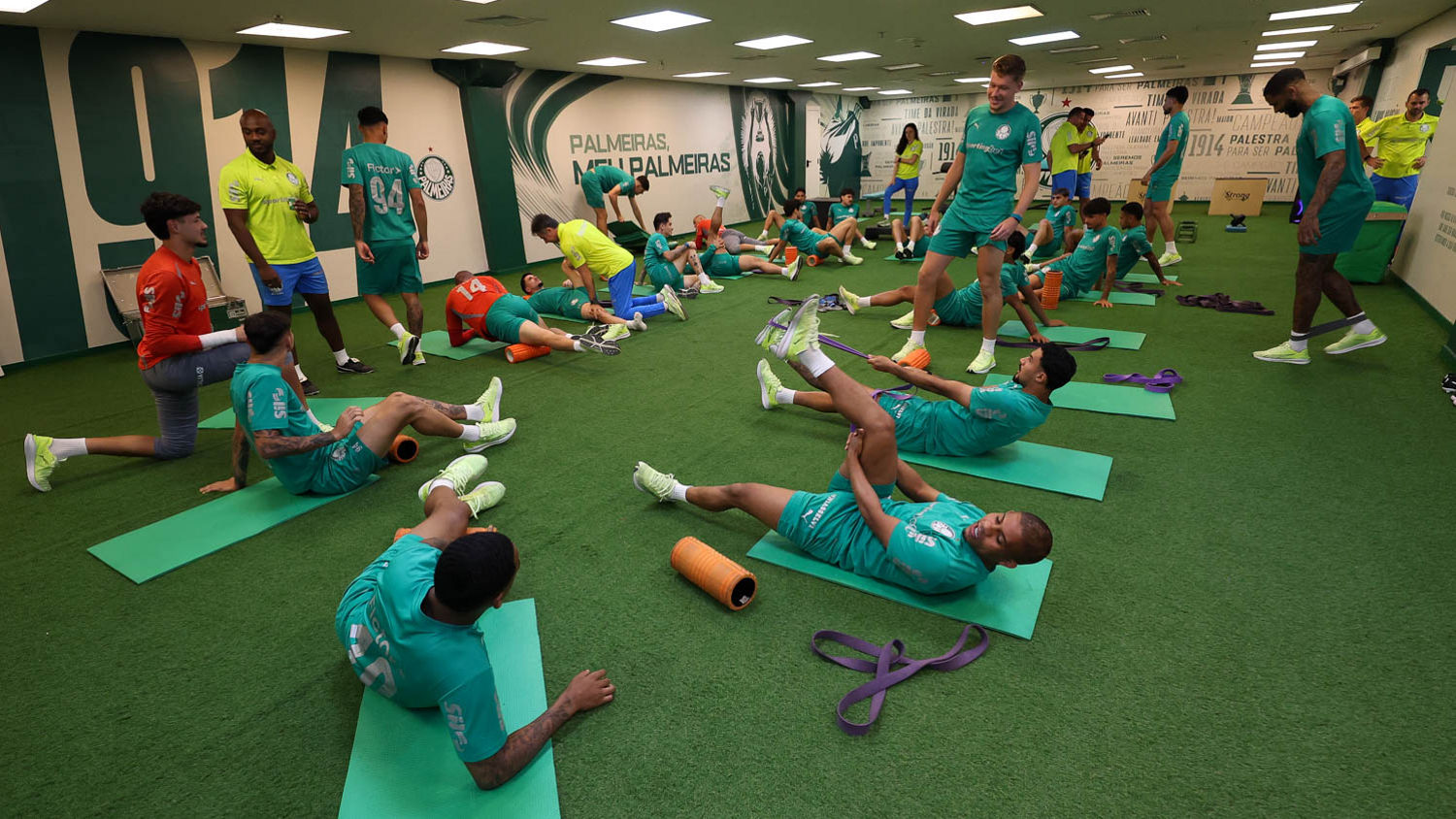Pendurados: Weverton, Piquerez, Aníbal Moreno, Lucas Evangelista, Facundo Torres e Vitor Castanheira (auxiliar técnico)
