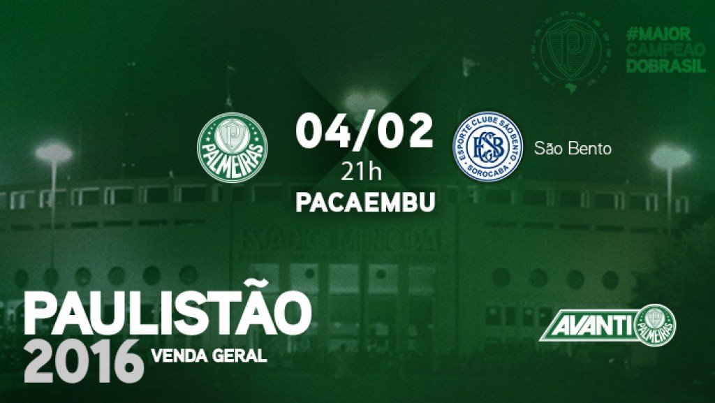 Os ingressos para o jogo entre Palmeiras e São Bento, que acontecerá no dia 04 de fevereiro (quinta-feira), às 21h, no estádio do Pacaembu, em duelo válido pela segunda rodada do Campeonato Paulista, estão à venda para todos os torcedores por meio do site www.futebolcard.com, sendo que 15 mil foram vendidos antecipadamente – os setores Arquibancadas Verde e Amarela estão esgotados.