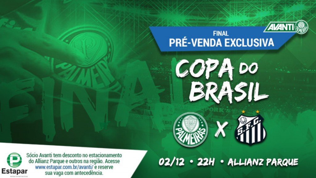 Os ingressos para o jogo entre Palmeiras e Santos, que acontecerá no dia 02 de dezembro (quarta-feira), às 22h, no Allianz Parque, pela grande decisão da Copa do Brasil, estão à venda para sócios-torcedores Avanti desde domingo (22), às 10h, por meio do site www.avantipalmeiras.com.br, sendo que 32 mil foram vendidos antecipadamente – os setores Cadeira Gol Norte, Cadeira Gol Sul e Cadeira Central Leste estão esgotados.