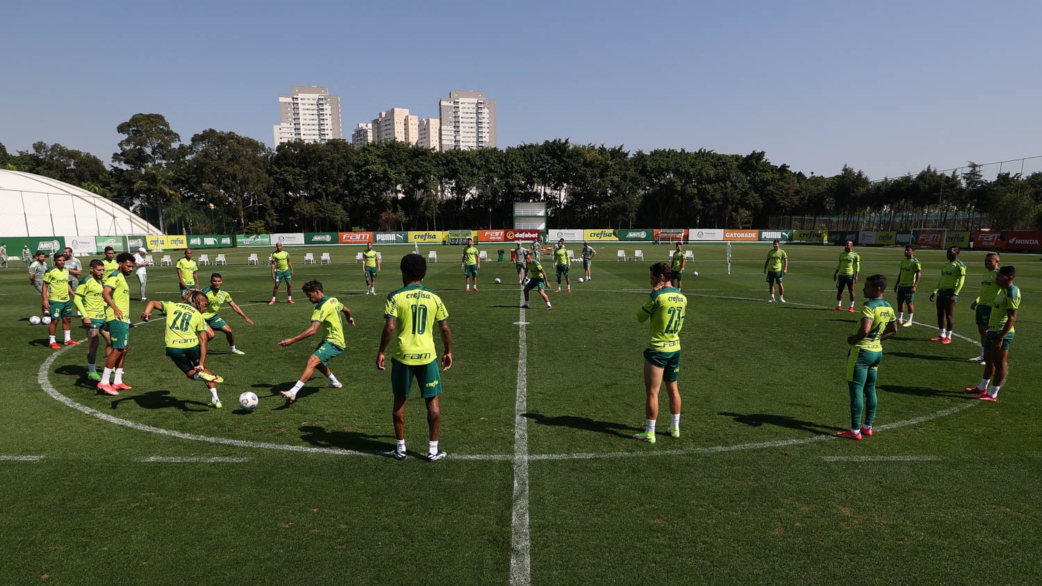 Junto a estacas demarcando as posições no gramado, os jogadores realizaram um trabalho posicional com ênfase nas movimentações, triangulações e finalizações em gol. O técnico Abel Ferreira e sua comissão orientaram ativamente as transições, trocas de posição e jogadas específicas, além dos arremates a gol de curta e longa distância.
