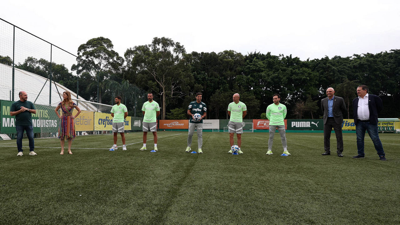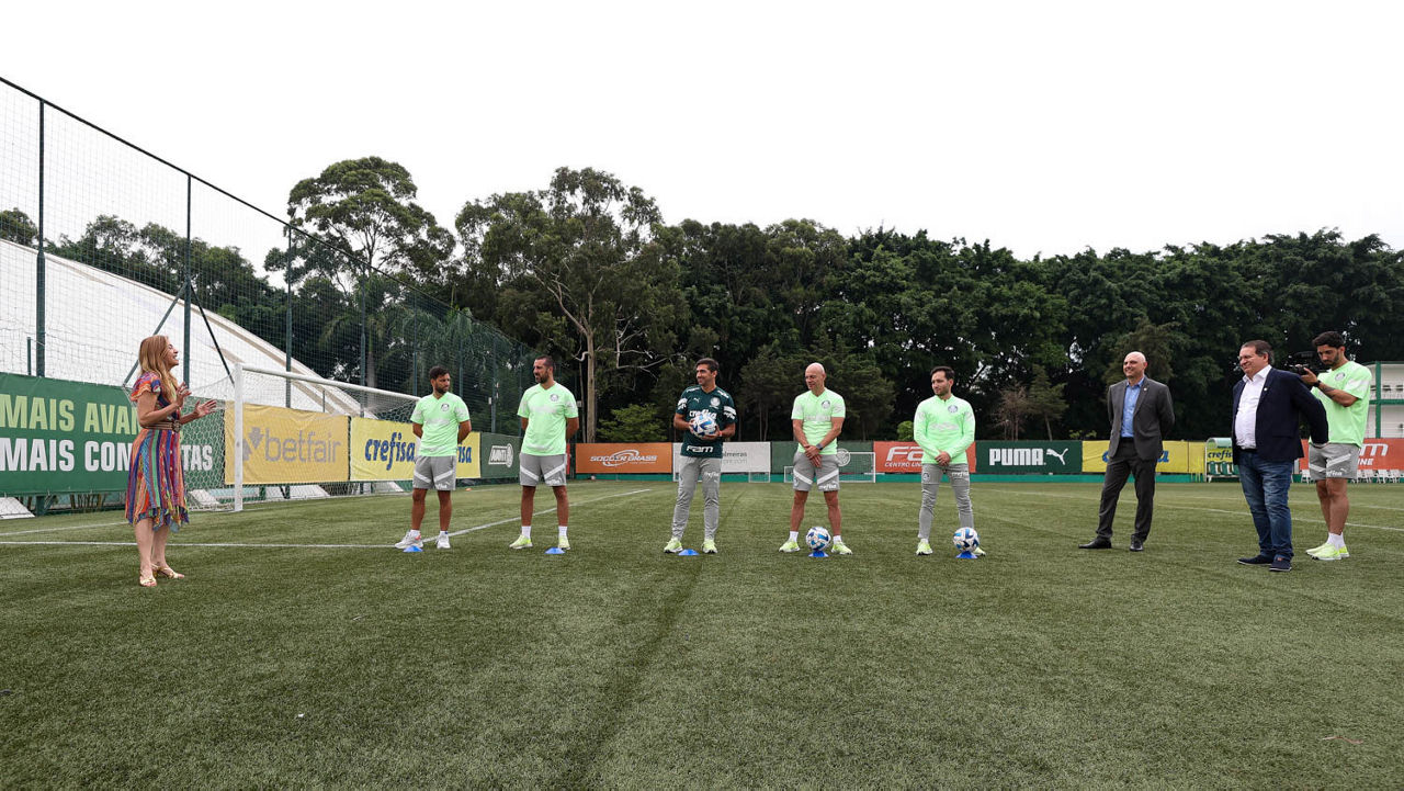 Abel Ferreira e sua comissão técnica receberam bolas autografadas por colaboradores da Academia de Futebol (Foto: Cesar Greco/Palmeiras/by Canon)