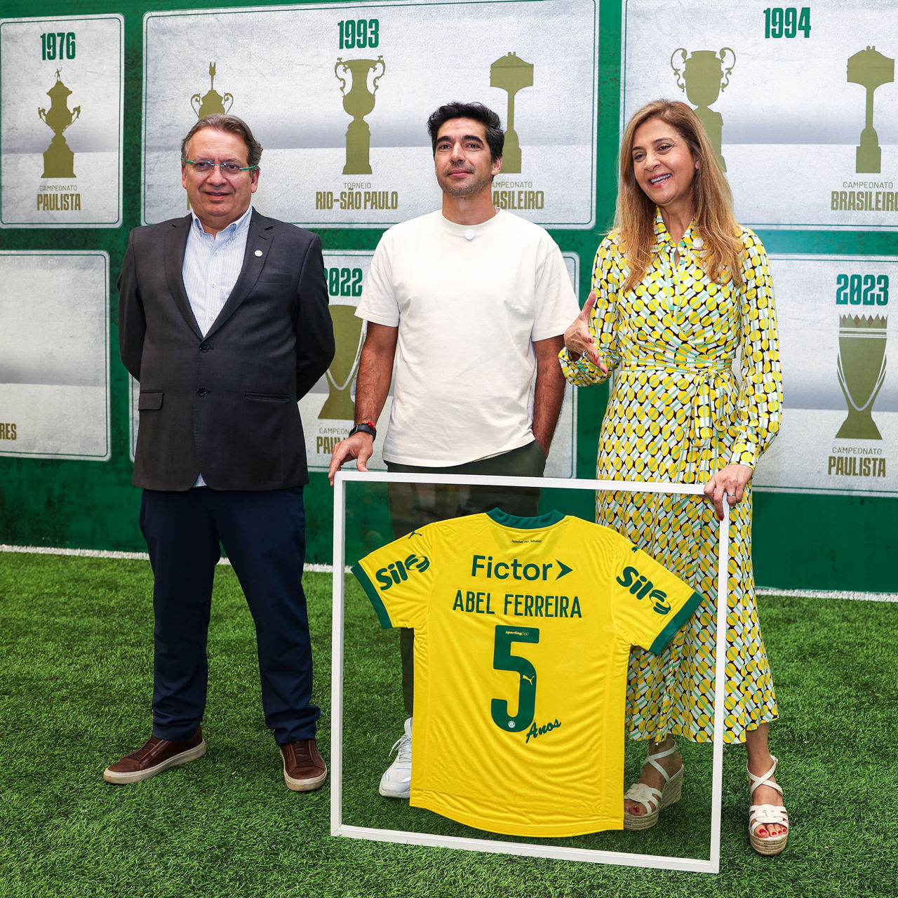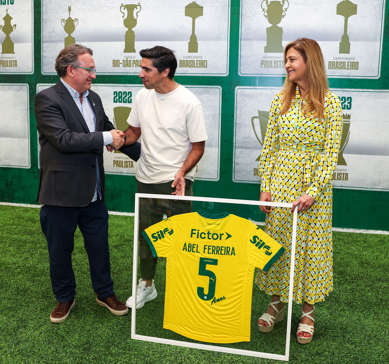O técnico Abel Ferreira foi homenageado nesta terça-feira (04) pelo Palmeiras em celebração aos cinco anos de clube completados na semana passada. Anunciado pelo Verdão no dia 30 de outubro de 2020, o português recebeu uma camisa comemorativa da presidente Leila Pereira e do vice-presidente Paulo Buosi na Academia de Futebol.