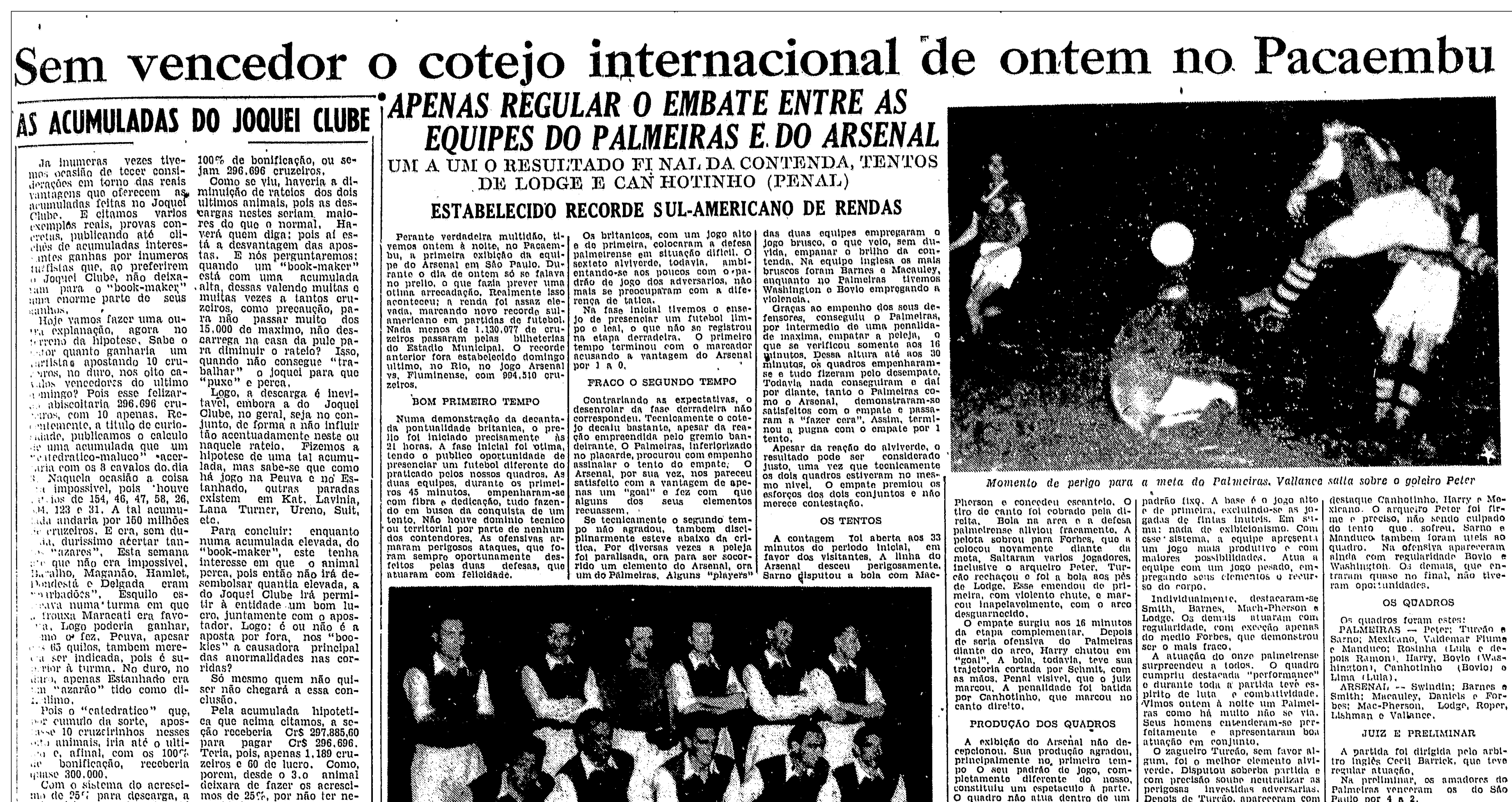 Relato da Folha de S. Paulo sobre o empate entre Palmeiras e Arsenal no Pacaembu (Acervo Histórico)