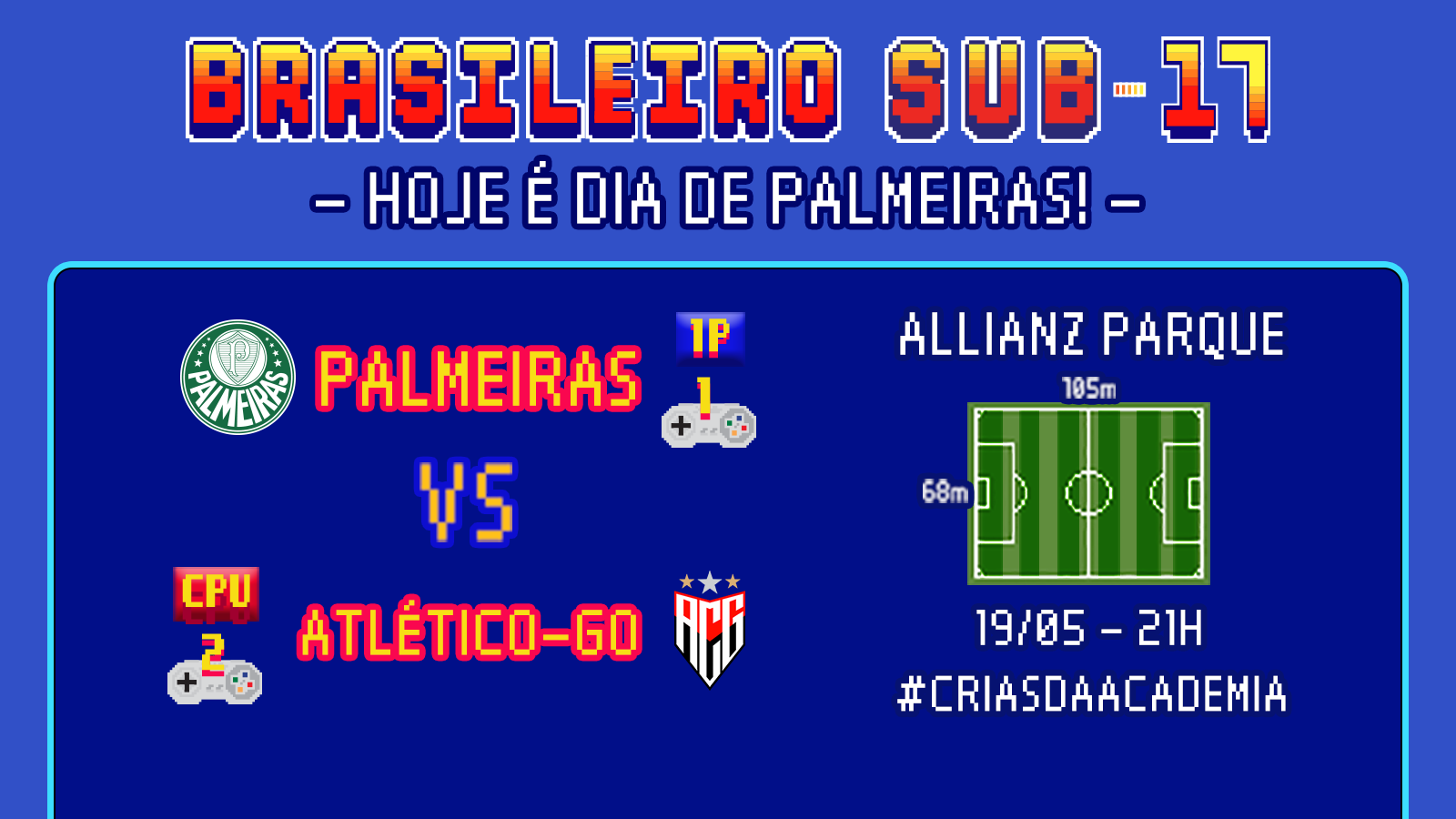 A equipe Sub-17 do Palmeiras encara o Atlético-GO nesta quarta-feira (19), às 21h, no Allianz Parque, pela terceira rodada do Campeonato Brasileiro da categoria. A partida será transmitida pelo SporTV.