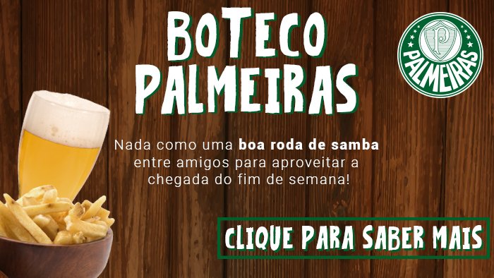 Aproveite o ‘Boteco Palmeiras’ com petiscos à vontade no Pizza Bar do clube Postado em 6 de julho de 2017 - 11:49 por admin-plm. Departamento de Comunicação