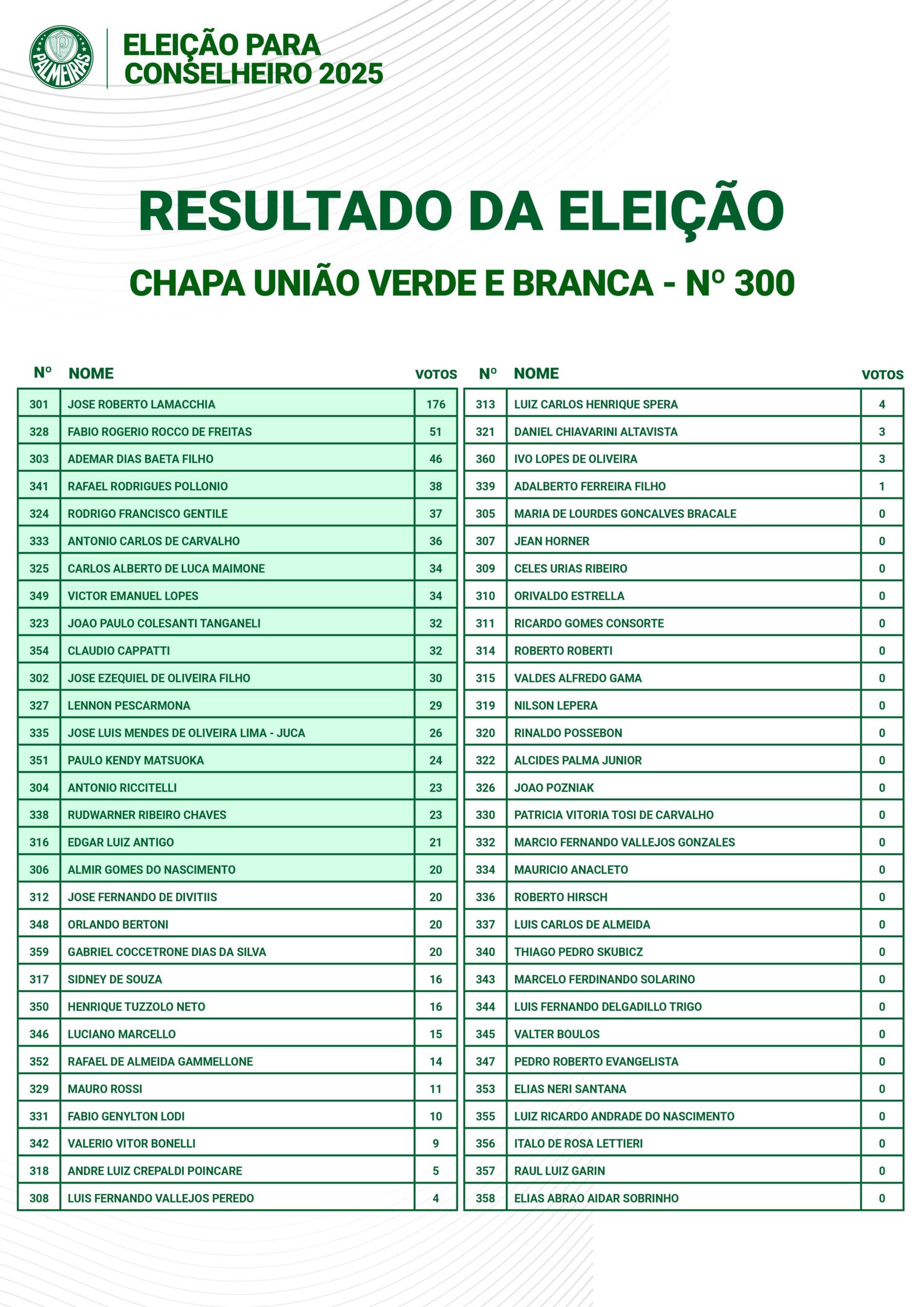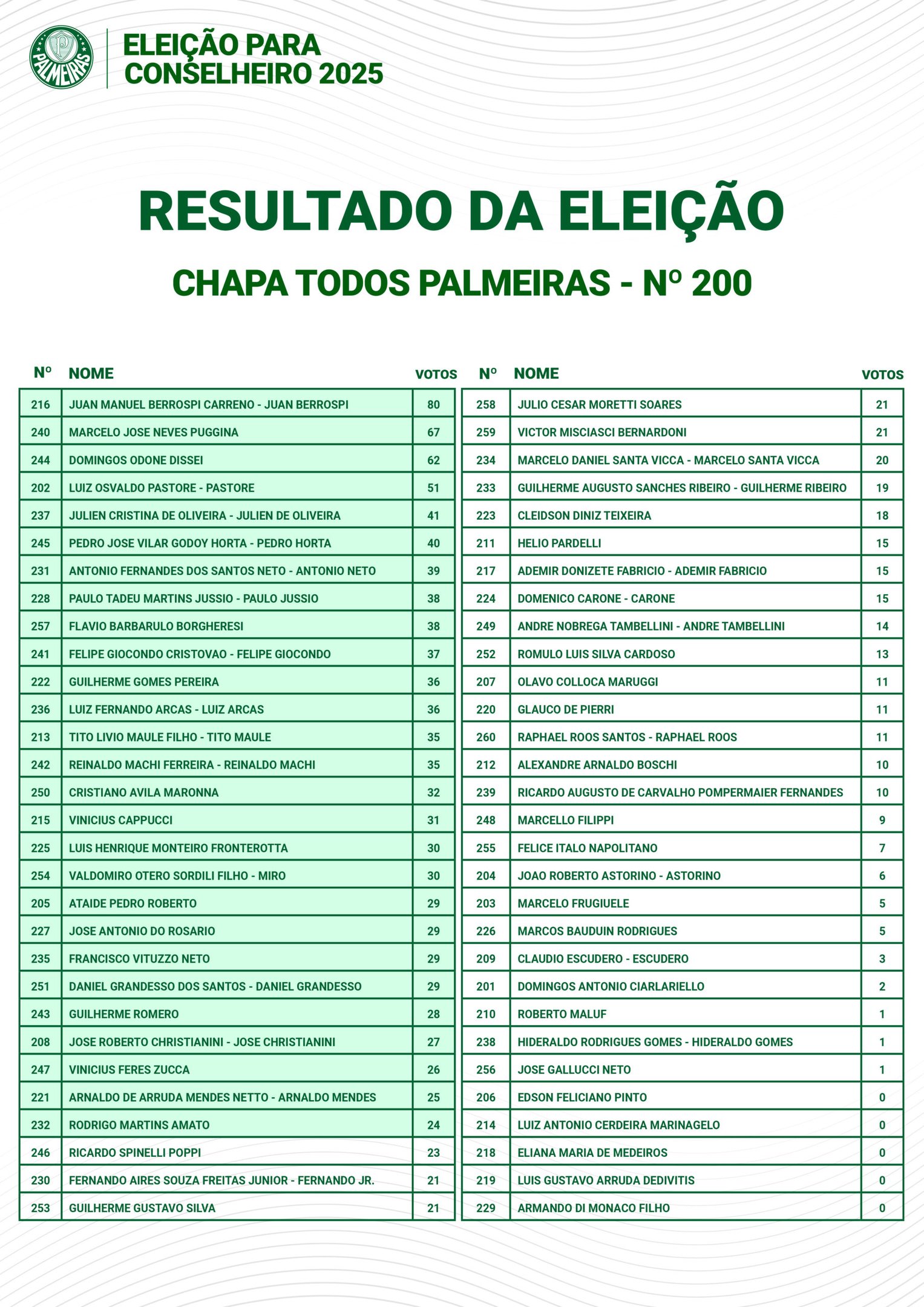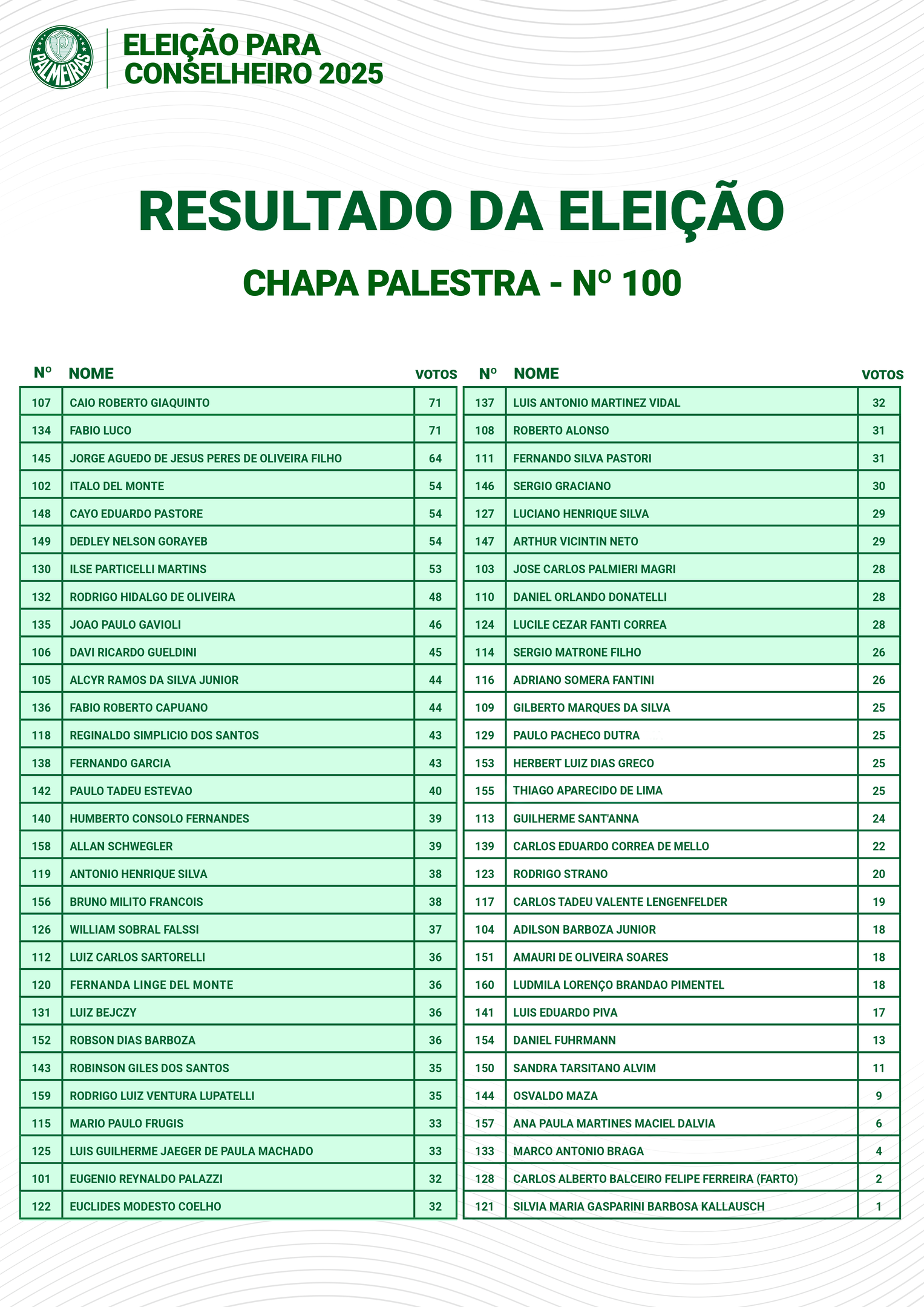 Com 180 candidatos distribuídos entre três chapas – 100 – Palestra, 200 – Todos Palmeiras e 300 – UVB –, cada eleitor pôde escolher apenas um nome. Os candidatos não eleitos foram listados como suplentes, seguindo a ordem de maior votação. Em caso de empate, a matrícula mais antiga determinou a posição.