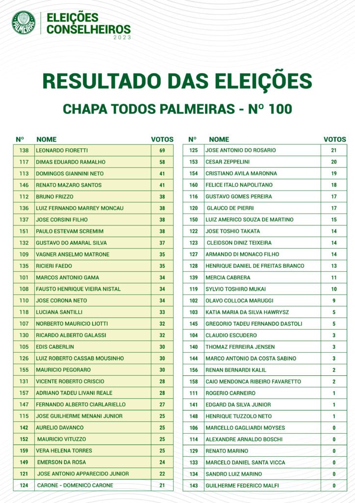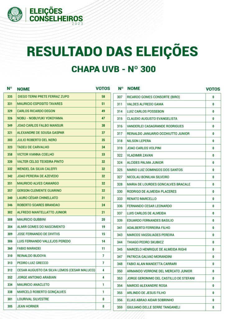 Os associados tiveram opções de chapas, tendo 60 candidatos em cada uma: 100 – Todos Palmeiras; 200 – Palestra; 300 – UVB, e poderiam escolher apenas um candidato entre os 180.