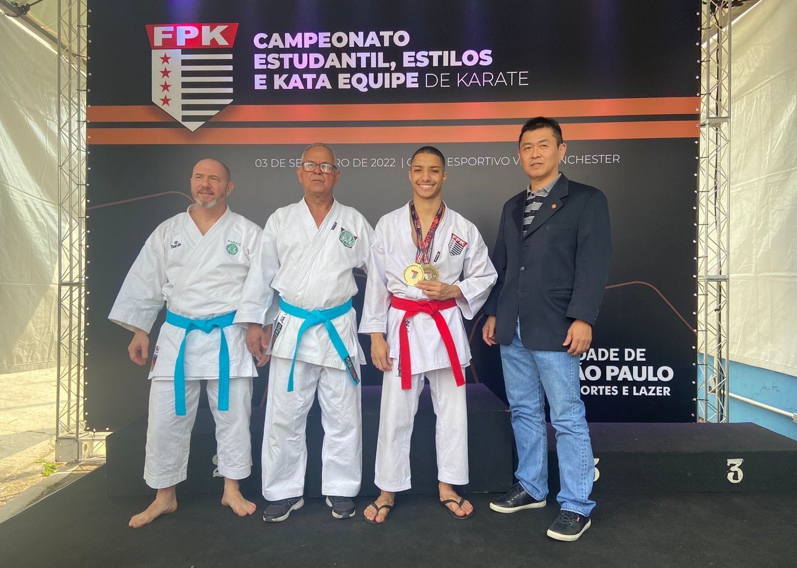 Regis Calvário, Jair Davanso e Gustavo Maziero (esq. para dir.) representaram o Verdão no Campeonato Estudantil, Estilos e Kata