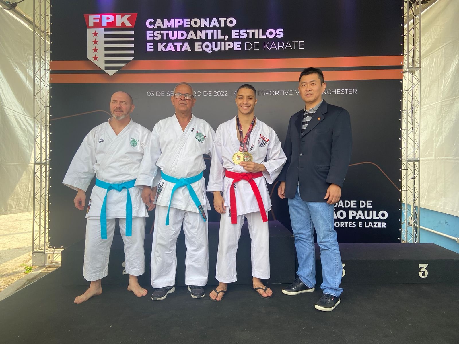Regis Calvário, Jair Davanso e Gustavo Maziero (esq. para dir.) representaram o Verdão no Campeonato Estudantil, Estilos e Kata