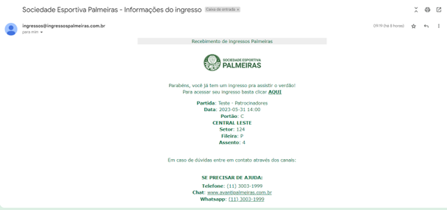 Seu convidado receberá um e-mail com o nome e o ingresso já atribuído com os dados do jogo, portão, setor, bloco, fileira e assento.