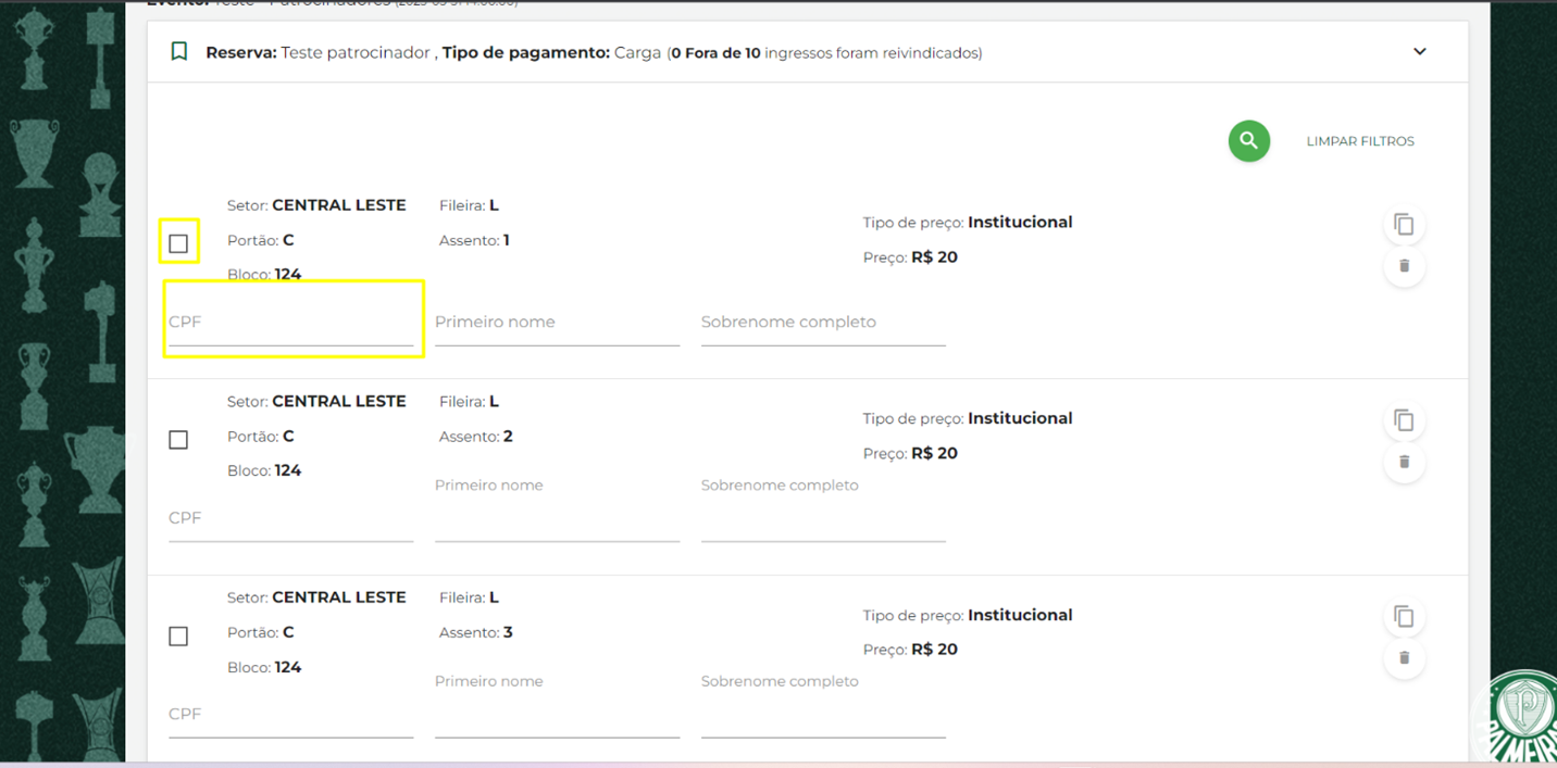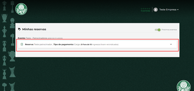 – Acesse o sistema de vendas de ingressos do Palmeiras (www.ingressospalmeiras.com.br) e, no menu superior, selecione Reservas. Na página Minhas Reservas, clique na reserva para a partida e o sistema mostrará todos os ingressos, um a um, para você começar a atribuir aos seus convidados.
