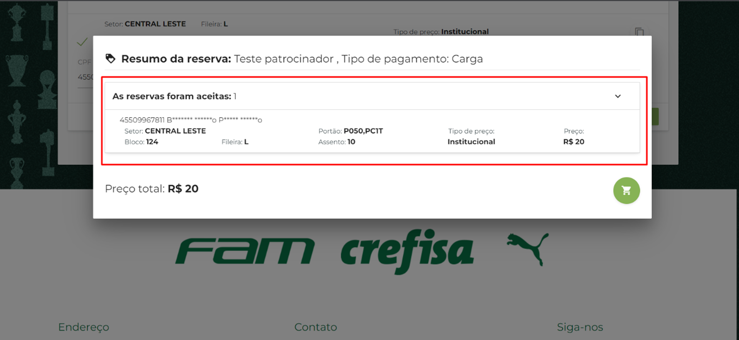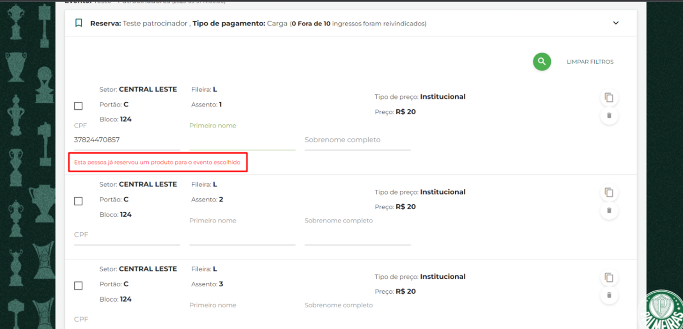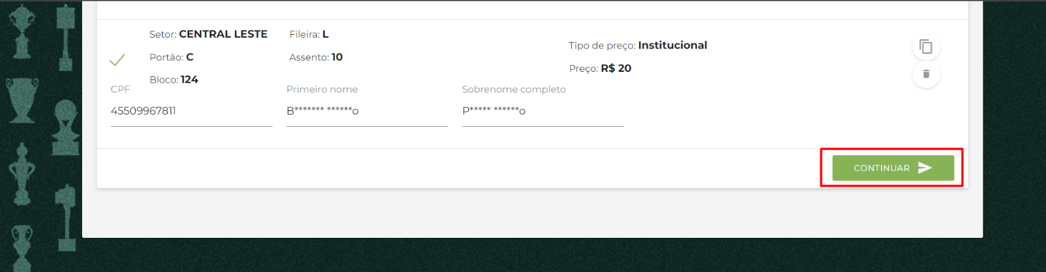 Pronto, o sistema mostrará o nome de seu convidado com um ingresso já atribuído e os dados do portão, setor, bloco, fileira e assento.