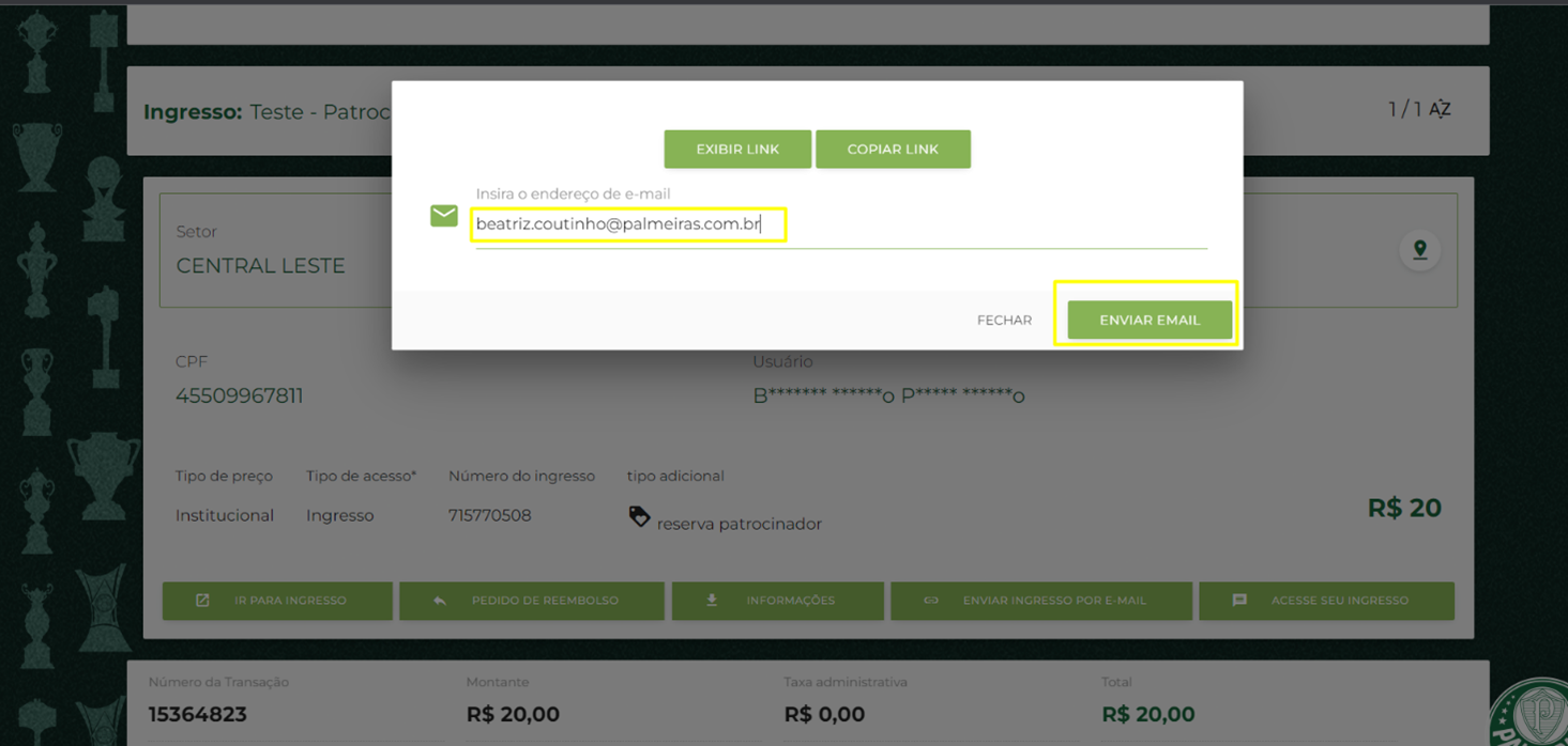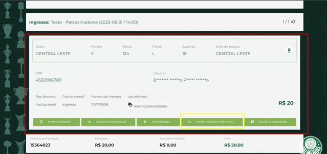 . Na tela seguinte, no menu de botões, clique em Enviar ingresso por email.