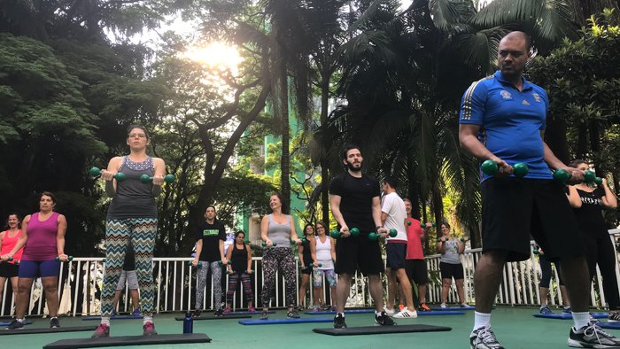 Após o alongamento, o triathlon teve 45 minutos de exercício físico aero local e, das 10h às 10h45, os associados fizeram um treino funcional de suar a camisa com movimentos que correspondiam à parte de corrida. Às 11h, a equipe seguiu para a piscina para realizar exercícios de natação adaptados especialmente para o evento. Por inovação, o movimento de pedalada foi feito dentro da água, através da hidroginástica.