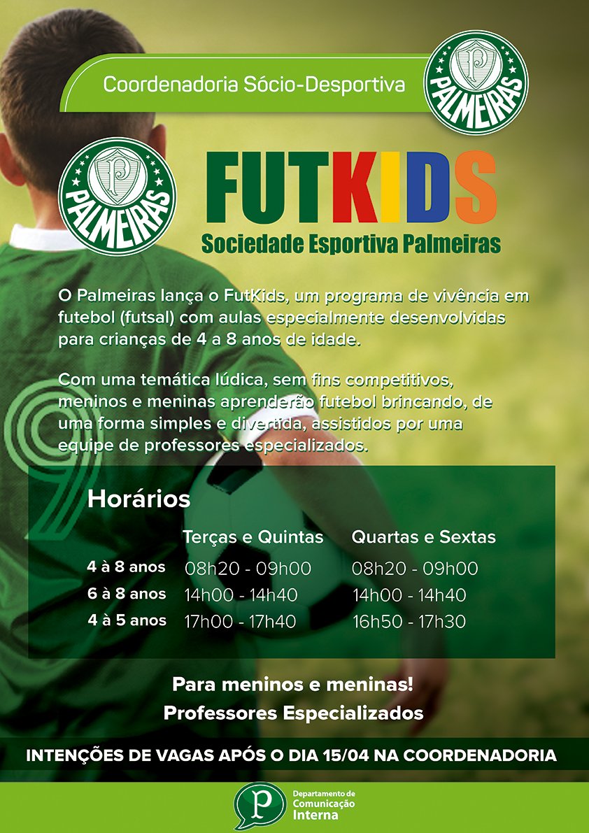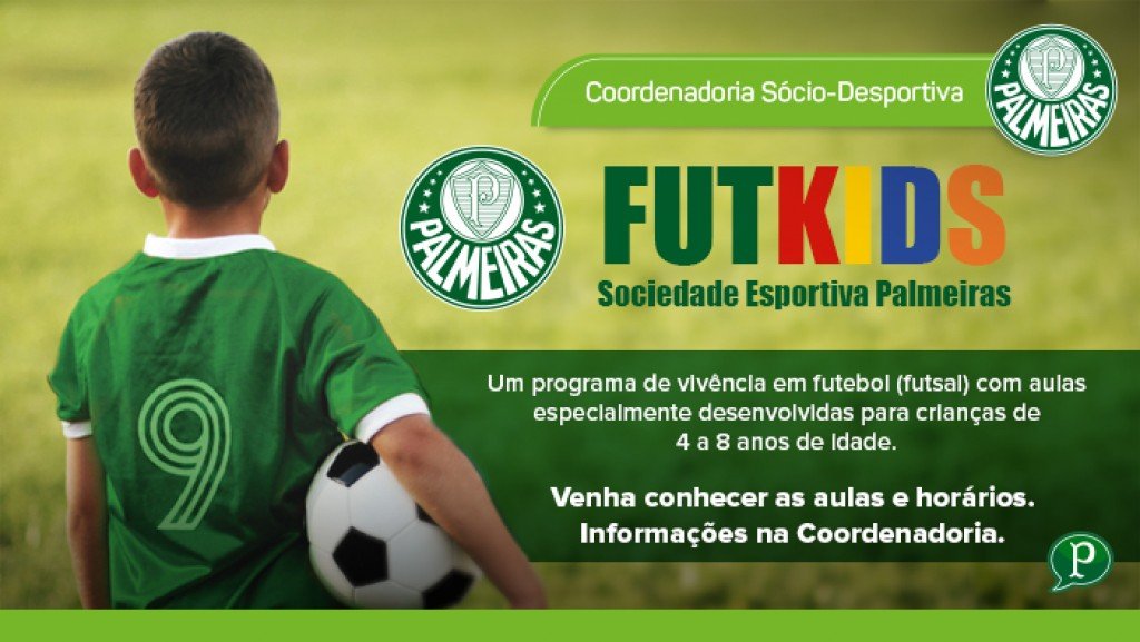 Os sócios do Palmeiras terão uma novidade esportiva neste mês de abril. Trata-se do FutKids, programa de vivência de futsal com aulas especialmente desenvolvidas para meninos e meninas de 4 a 8 anos de idade.