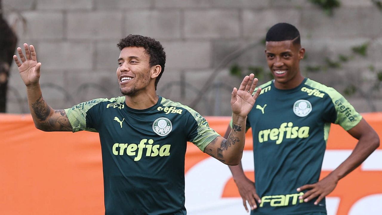 Os jogadores Benjamín Kuscevic e Fabricio (à direita) durante treinamento na Academia de Futebol (Foto: Cesar Greco/Palmeiras)