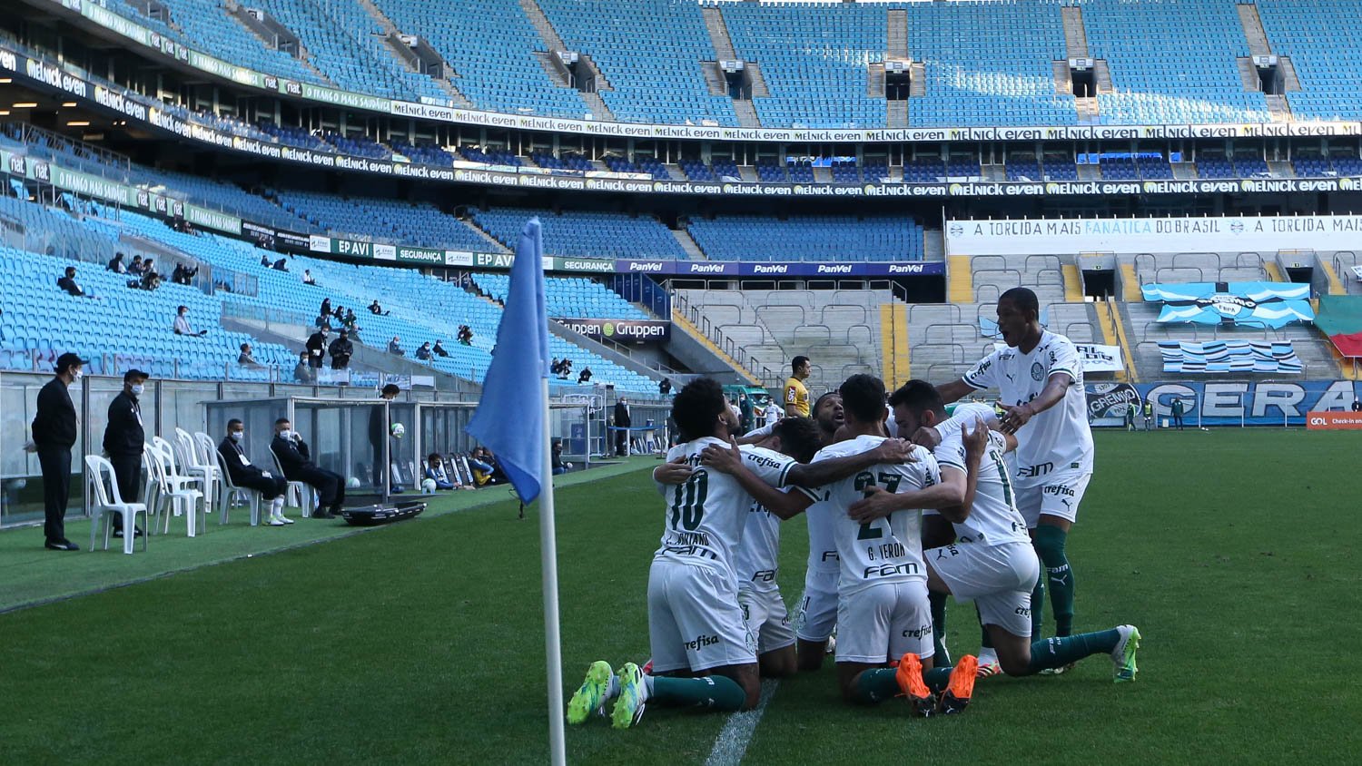 O Palmeiras visitou o Grêmio na tarde deste domingo (20) na Arena Grêmio, em Porto Alegre (RS), pela 11ª do Campeonato Brasileiro. Em uma partida muito disputada, porém, com poucos avanços ao último terço do campo por parte de ambas as equipes, o resultado final ficou em 1 a 1 – o gol Alviverde foi marcado por Raphael Veiga, aos 25 minutos do segundo tempo, mas Ferreira descontou para o Grêmio e deixou tudo igual aos 46.