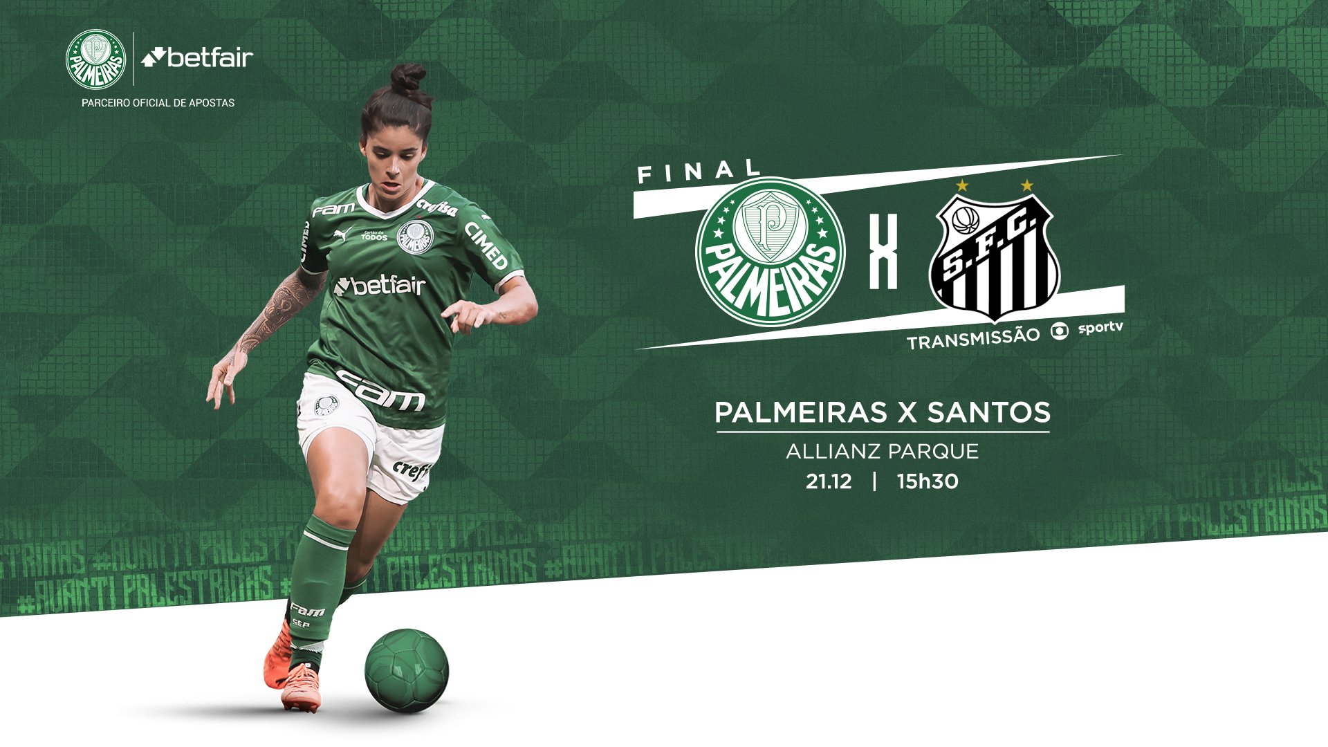 O Palmeiras decide o título do Paulista Feminino na tarde desta quarta-feira (21), às 15h30, contra o Santos, no Allianz Parque. Com mais de 19 mil ingressos resgatados pela torcida palestrina, o duelo da volta será transmitido ao vivo por TV Globo, Estádio TNT Sports, Eleven Sports, YouTube do Paulistão, Paulistão Play, Facebook e Dale App.