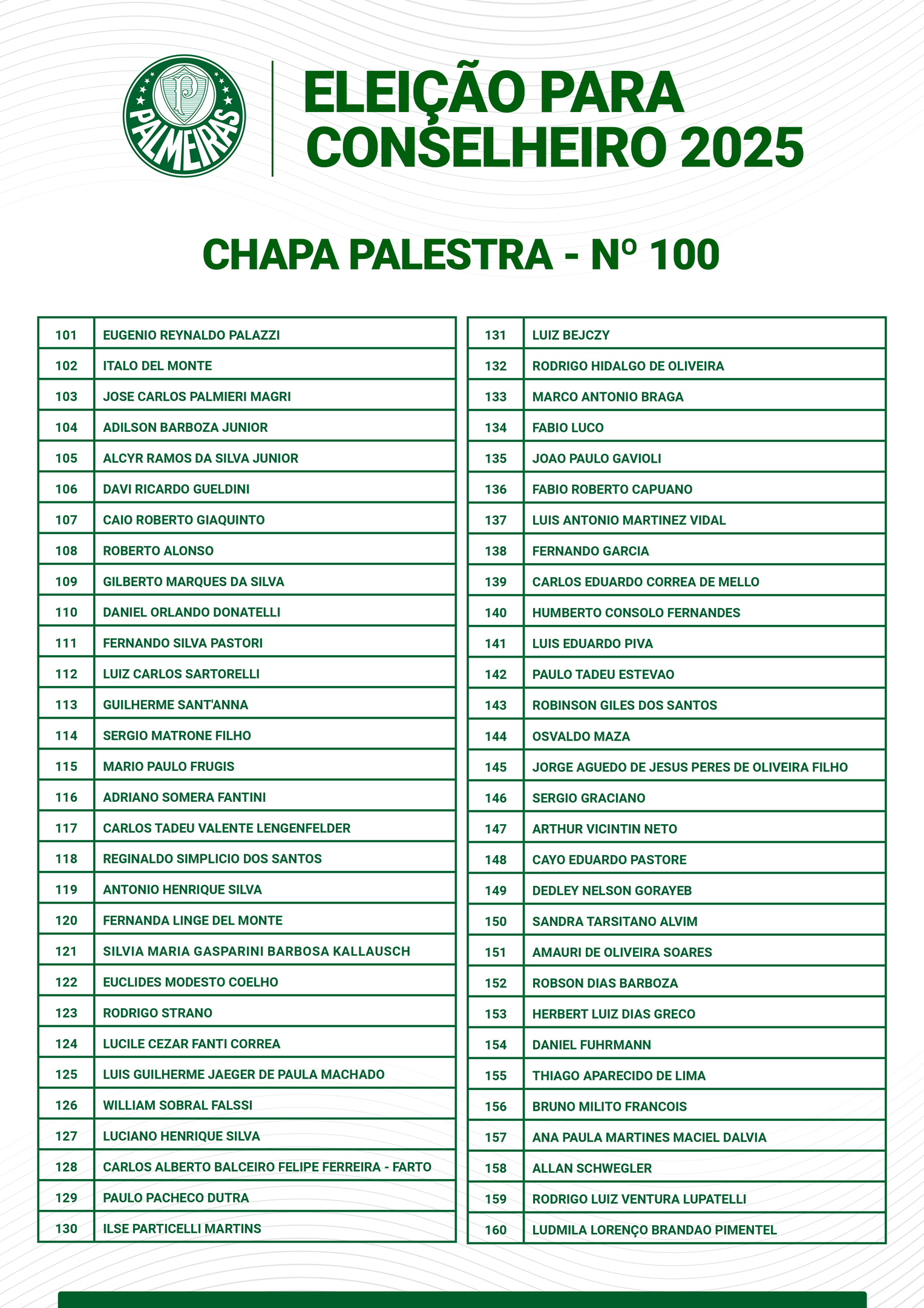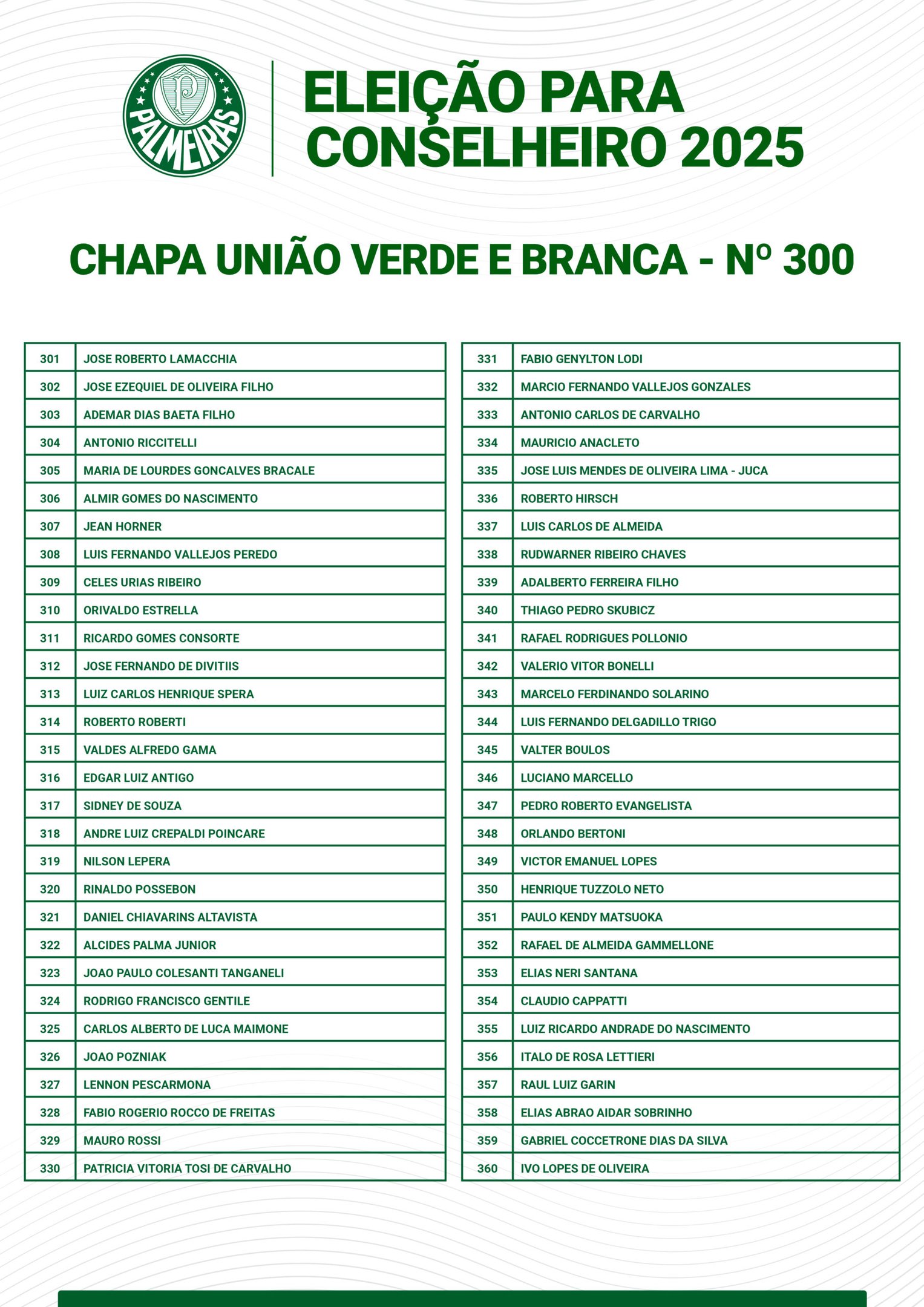 No próximo dia 15 de fevereiro, os associados do Palmeiras elegerão novos representantes para o Conselho Deliberativo do clube. A votação será realizada das 8h às 17h, no ginásio do Prédio Poliesportivo (andar térreo).