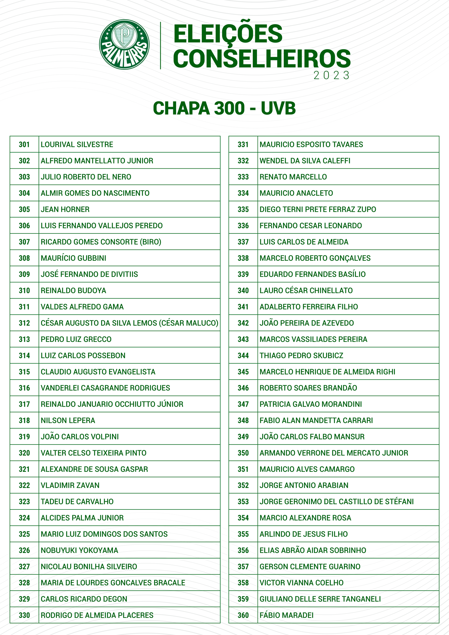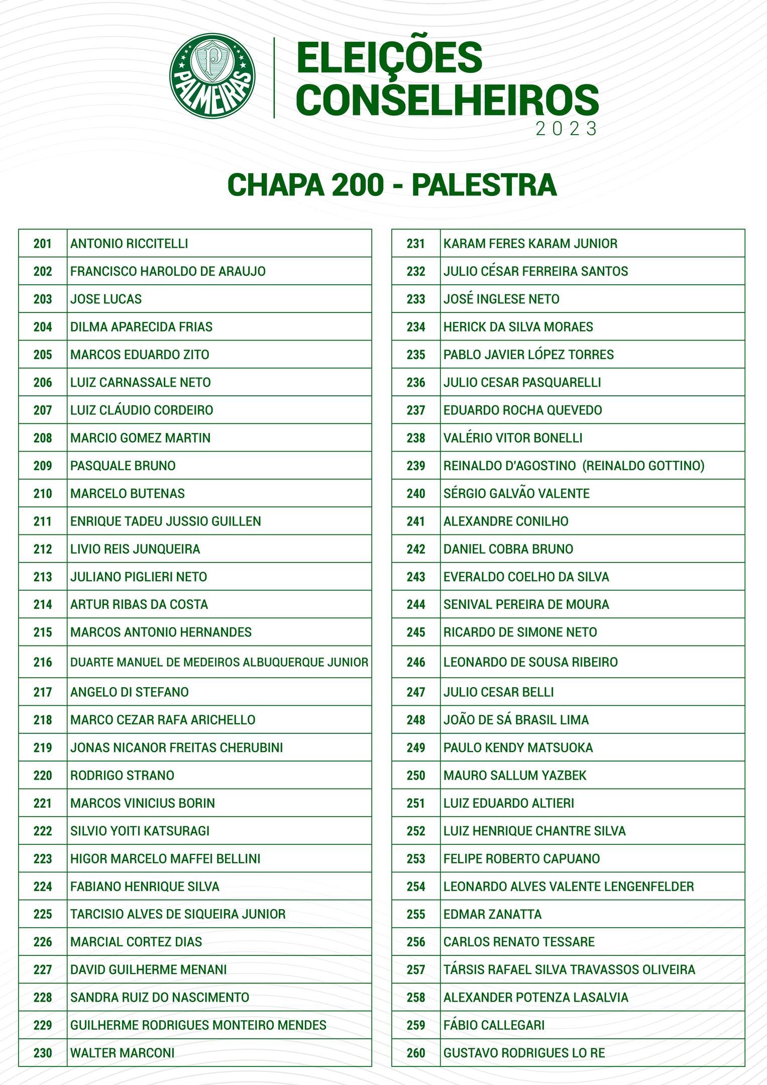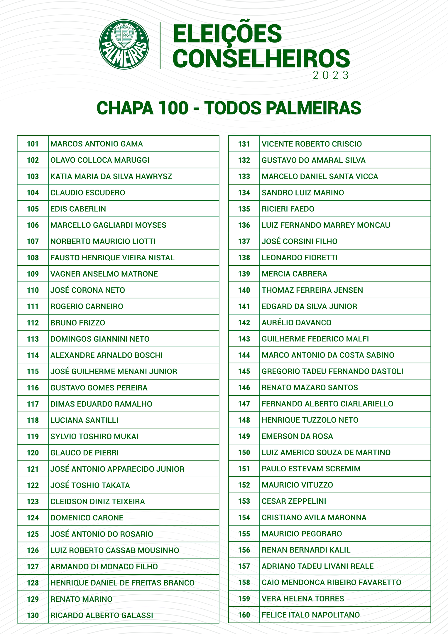 Os associados do Palmeiras elegerão no próximo dia 11 de fevereiro novos representantes para o Conselho Deliberativo do clube, em votação que ocorrerá das 08h às 17h no ginásio do Prédio Poliesportivo (andar térreo).