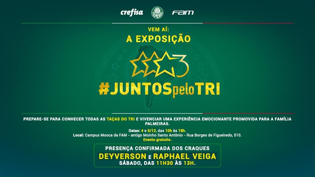 Nos dias 4 e 5 de dezembro (sábado e domingo), das 10h às 18h, estará aberta ao público a exposição #JuntosPeloTri, em homenagem à mais recente conquista da Sociedade Esportiva Palmeiras. As patrocinadoras e parceiras Crefisa e FAM são as responsáveis por promoverem o evento, que será realizado no Campus Mooca da FAM (antigo Moinho Santo Antônio).