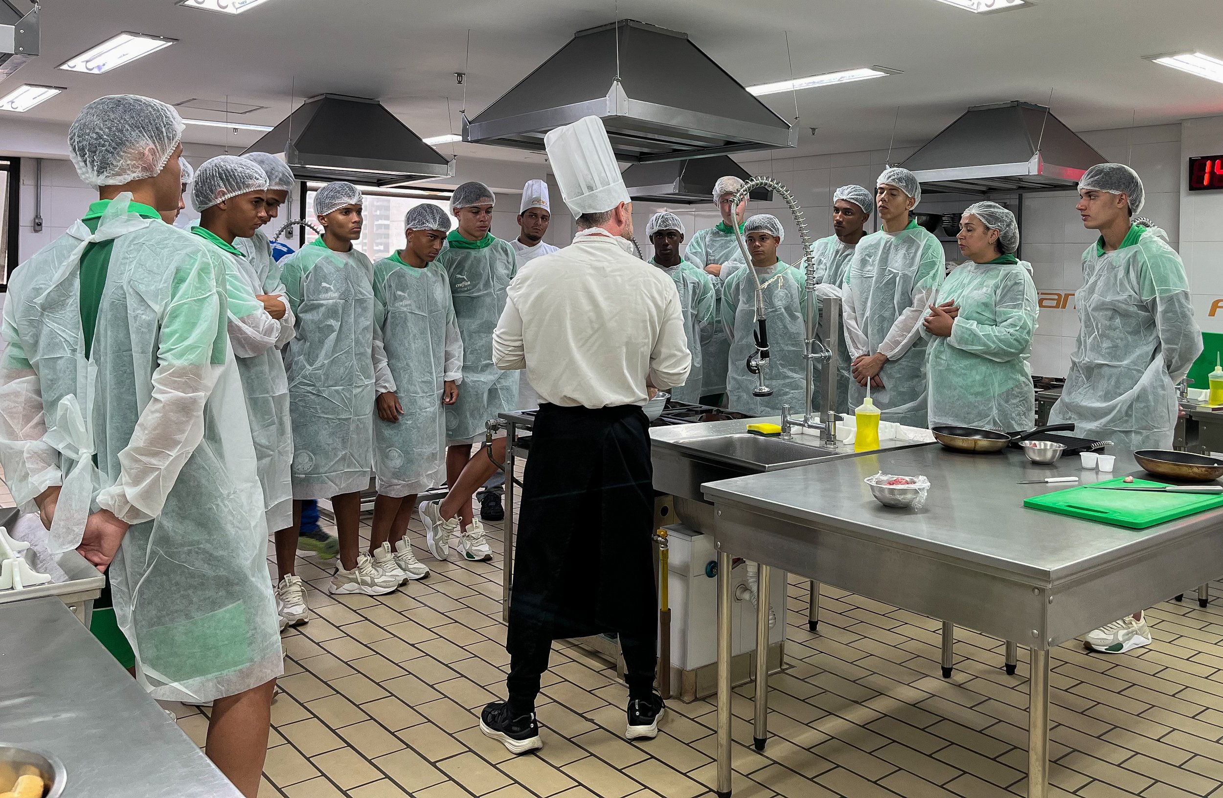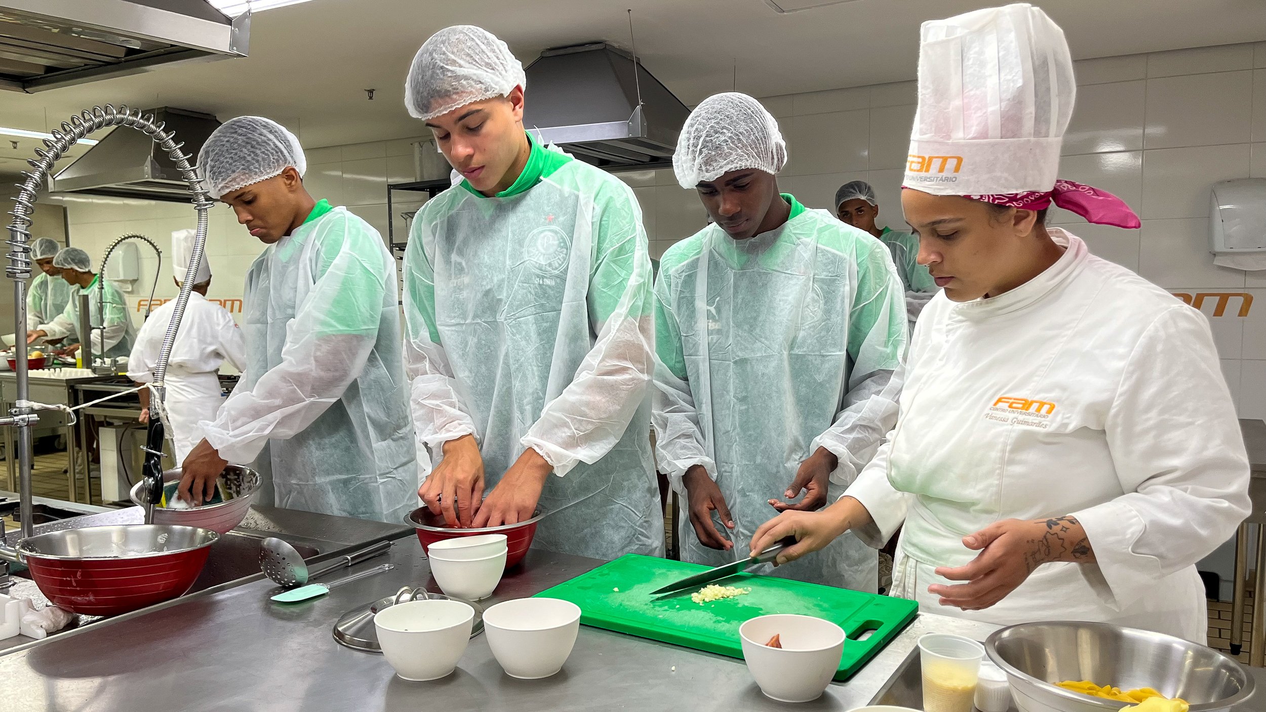 Na última semana, os jogadores do Sub-16 do Palmeiras participaram de uma aula de gastronomia na Faculdade das Américas (FAM), parceira alviverde em projetos voltados ao desenvolvimento social dos jovens. Orientados pelo Marcelo Malta, coordenador do curso de gastronomia da FAM, e pelo professor Féra Junior, 14 atletas prepararam hambúrgueres artesanais e um macarrão com molho de tomate natural.