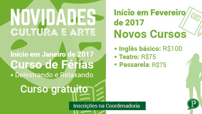 Cultura e Arte lança novos cursos para associados em 2017; inscreva-se Postado em 18 de novembro de 2016 - 15:27 por admin-plm. Departamento de Comunicação