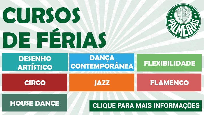 Cursos de Férias do Palmeiras: confira as modalidades e garanta sua inscrição Postado em 27 de junho de 2017 - 16:26 por admin-plm. Departamento de Comunicação