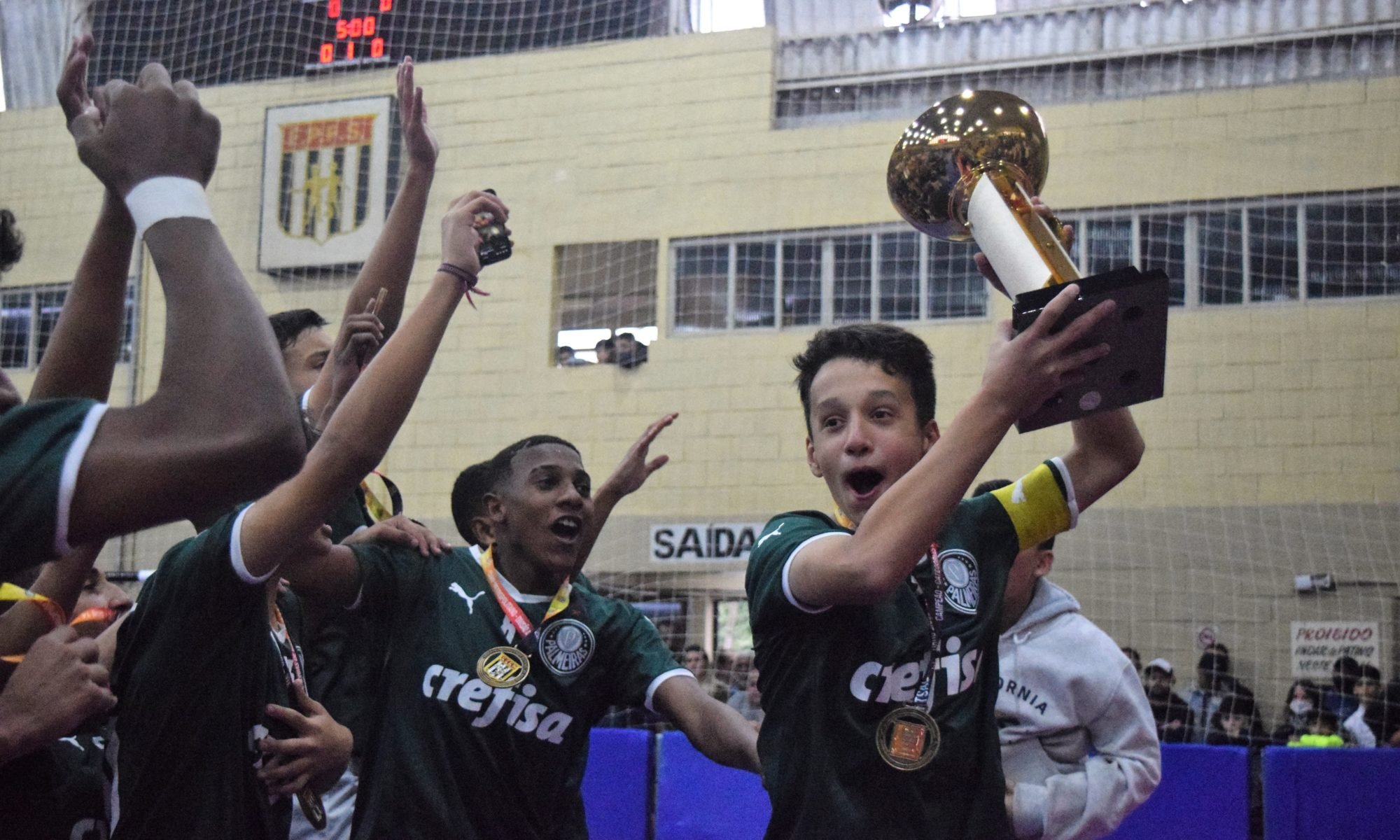 É campeão! O time Sub-14 do Palmeiras venceu o Corinthians, na tarde deste sábado (18), pelo placar de 4 a 3 e faturou o título do Campeonato Metropolitano de Futsal, no Ginásio Presidente Ciro II, na Penha, em São Paulo-SP. Os gols foram marcados por Luidi, Jorge, Ryan e Miguel.