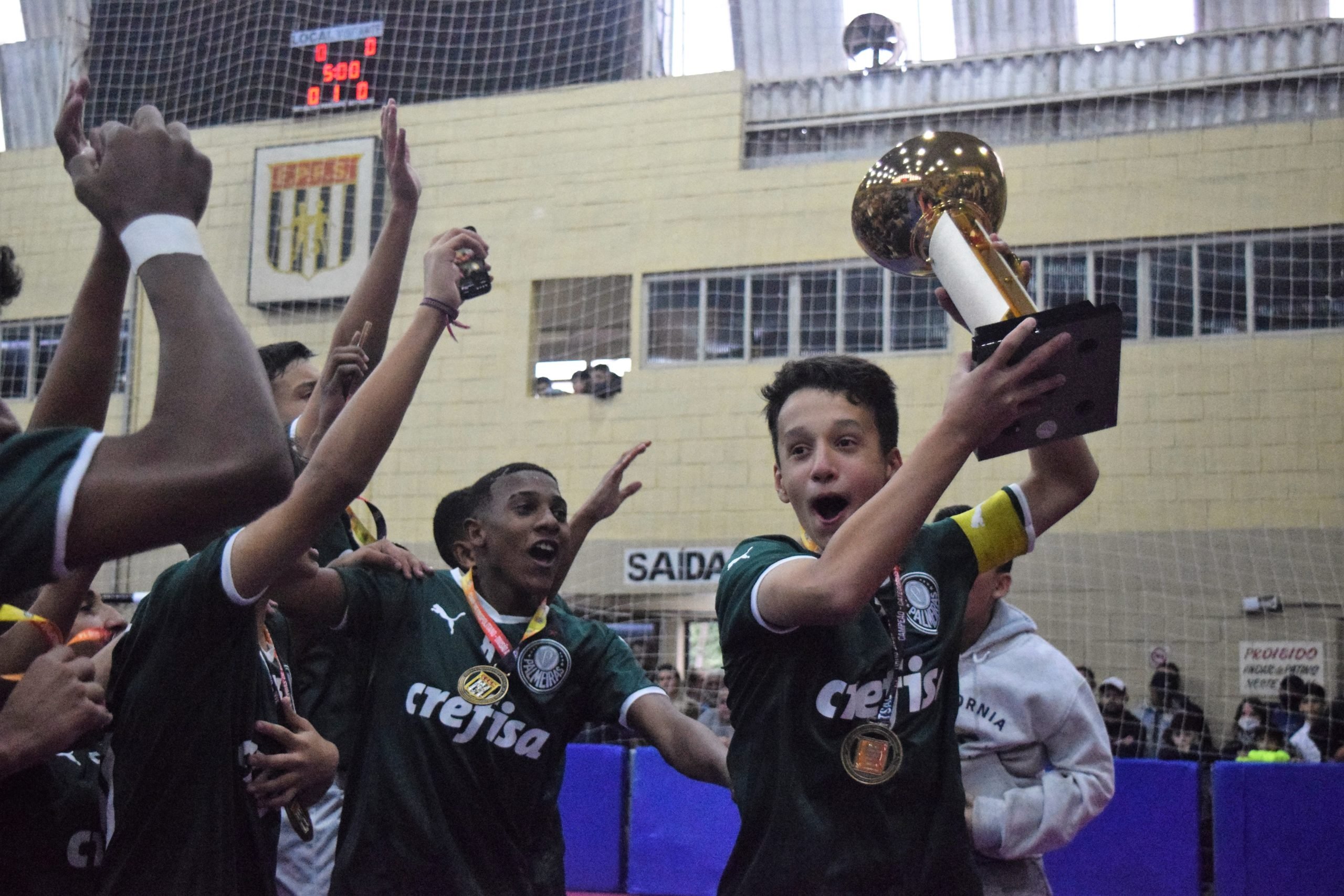 É campeão! O time Sub-14 do Palmeiras venceu o Corinthians, na tarde deste sábado (18), pelo placar de 4 a 3 e faturou o título do Campeonato Metropolitano de Futsal, no Ginásio Presidente Ciro II, na Penha, em São Paulo-SP. Os gols foram marcados por Luidi, Jorge, Ryan e Miguel.