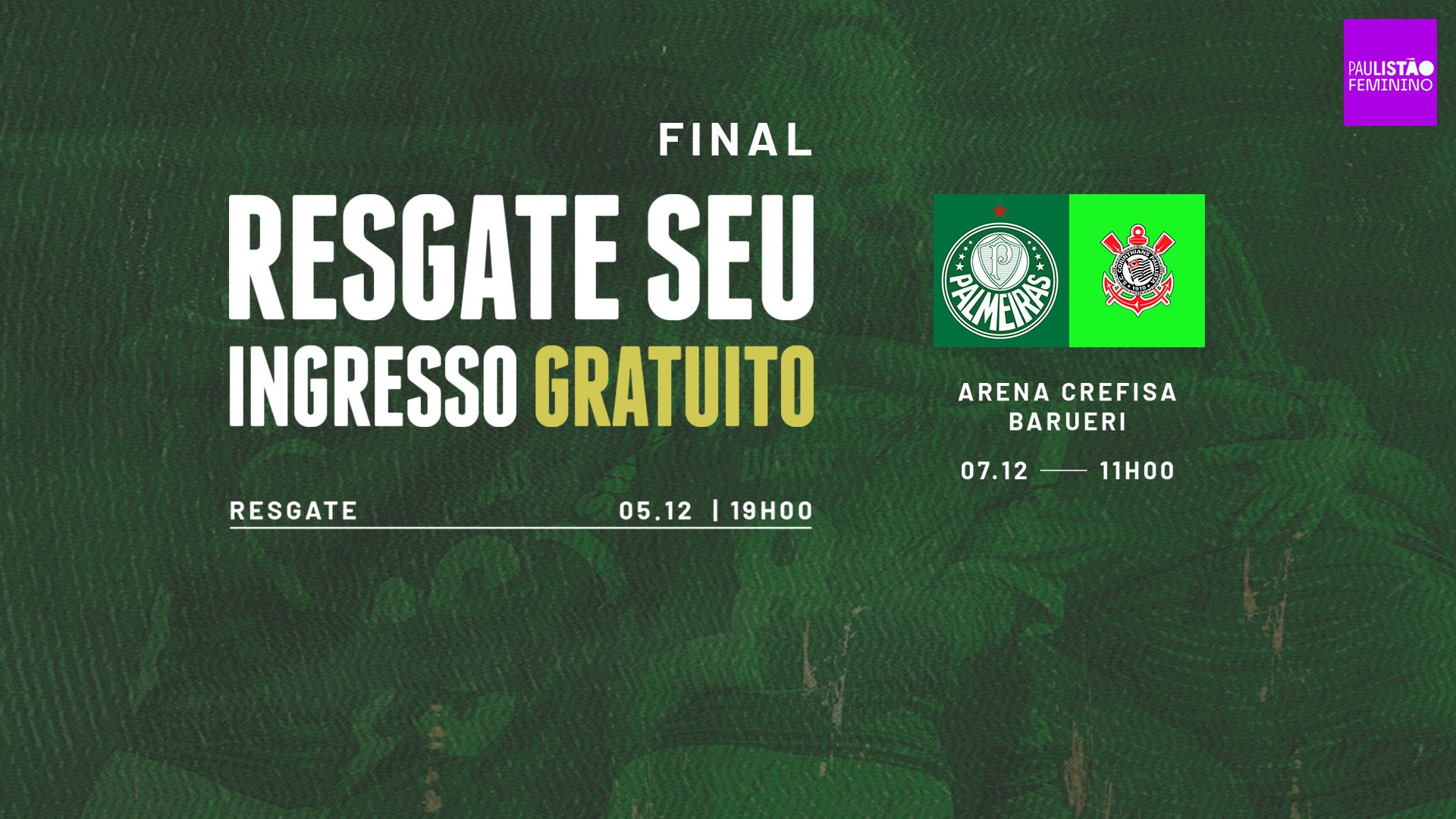 O Palmeiras enfrenta o Corinthians, no próximo domingo (07), às 11h, na Arena Crefisa Barueri, pelo jogo de ida da final do Paulista Feminino. A entrada será gratuita e o resgate do ingresso poderá ser feito a partir desta sexta-feira (05), às 19h, pelo site palmeiras.soudaliga.com.br – o acesso será feito por meio de reconhecimento facial.