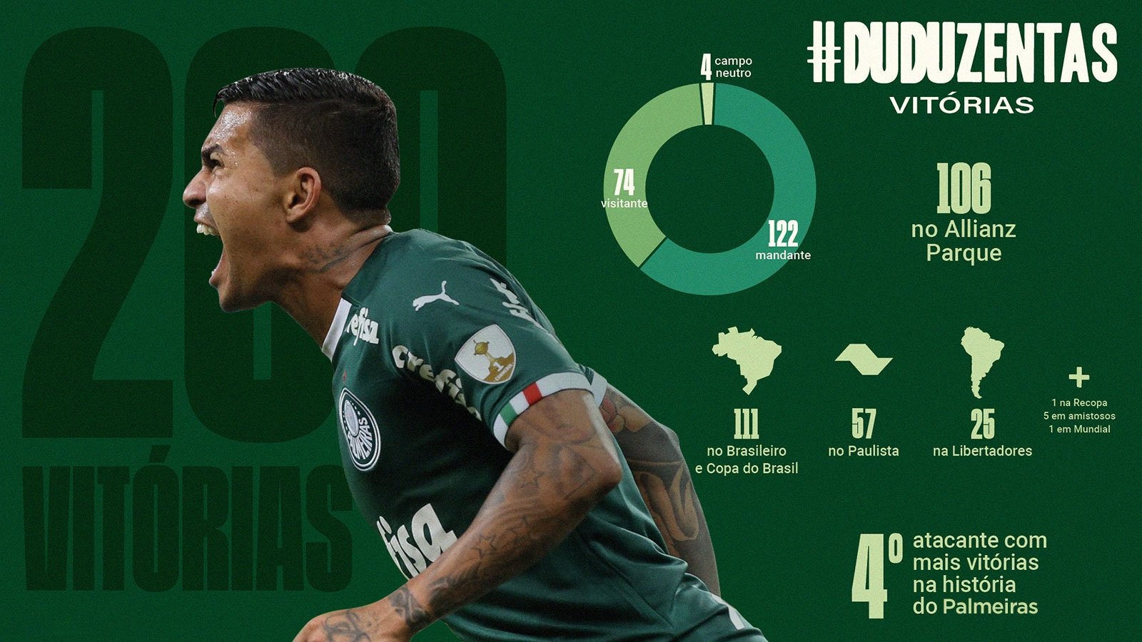 Com ao menos um gol marcado em 53 desses duzentos triunfos pelo Verdão, Dudu é o quarto atacante com mais vitórias na história do clube, atrás só de Heitor (3º, com 248 vitórias); Edu Bala (2º, com 254 vitórias); e Nei (1º, com 255 vitórias). Será que o Baixinho, um dia, ainda se tornará o número um deste ranking?