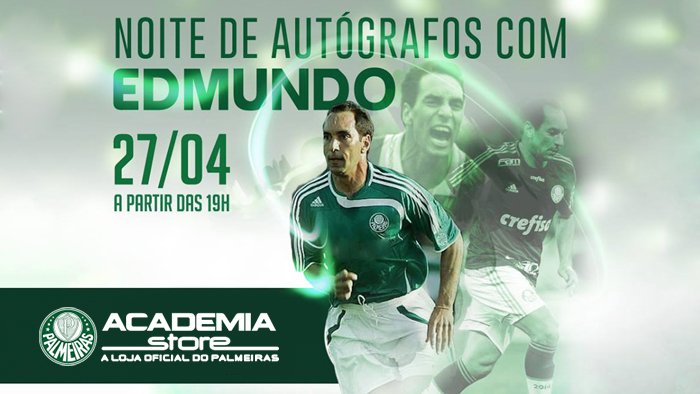O ex-jogador e atual comentarista esportivo Edmundo, um dos maiores astros da equipe do Palmeiras na década de 1990, estará na Academia Store do Shopping West Plaza para uma sessão de autógrafos. O evento acontecerá na próxima quinta-feira (27), das 19h às 22h. Uma grande oportunidade para os torcedores palestrinos conhecerem o ídolo.
