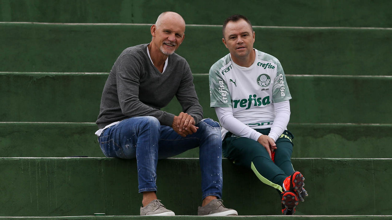 Preparador de goleiros da Seleção Brasileira, Taffarel (à esquerda) acompanhou o treino do Verdão (Cesar Greco/Palmeiras)