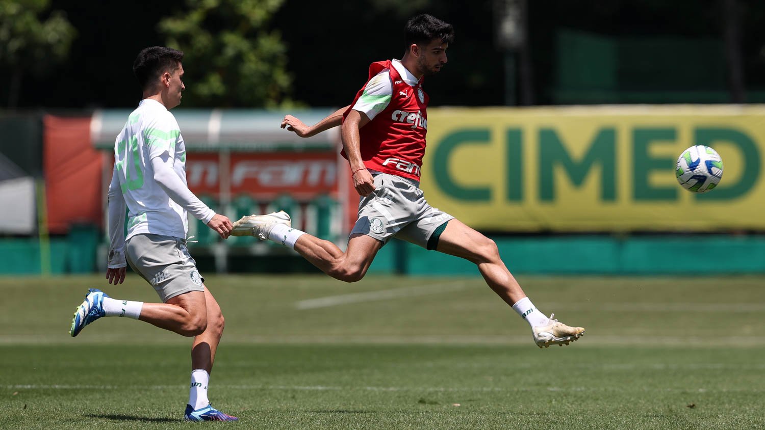 Os jogadores Eduard Atuesta (à esquerda) e Luis Guilherme durante treinamento na Academia de Futebol (Foto: Cesar Greco/Palmeiras/by Canon)
