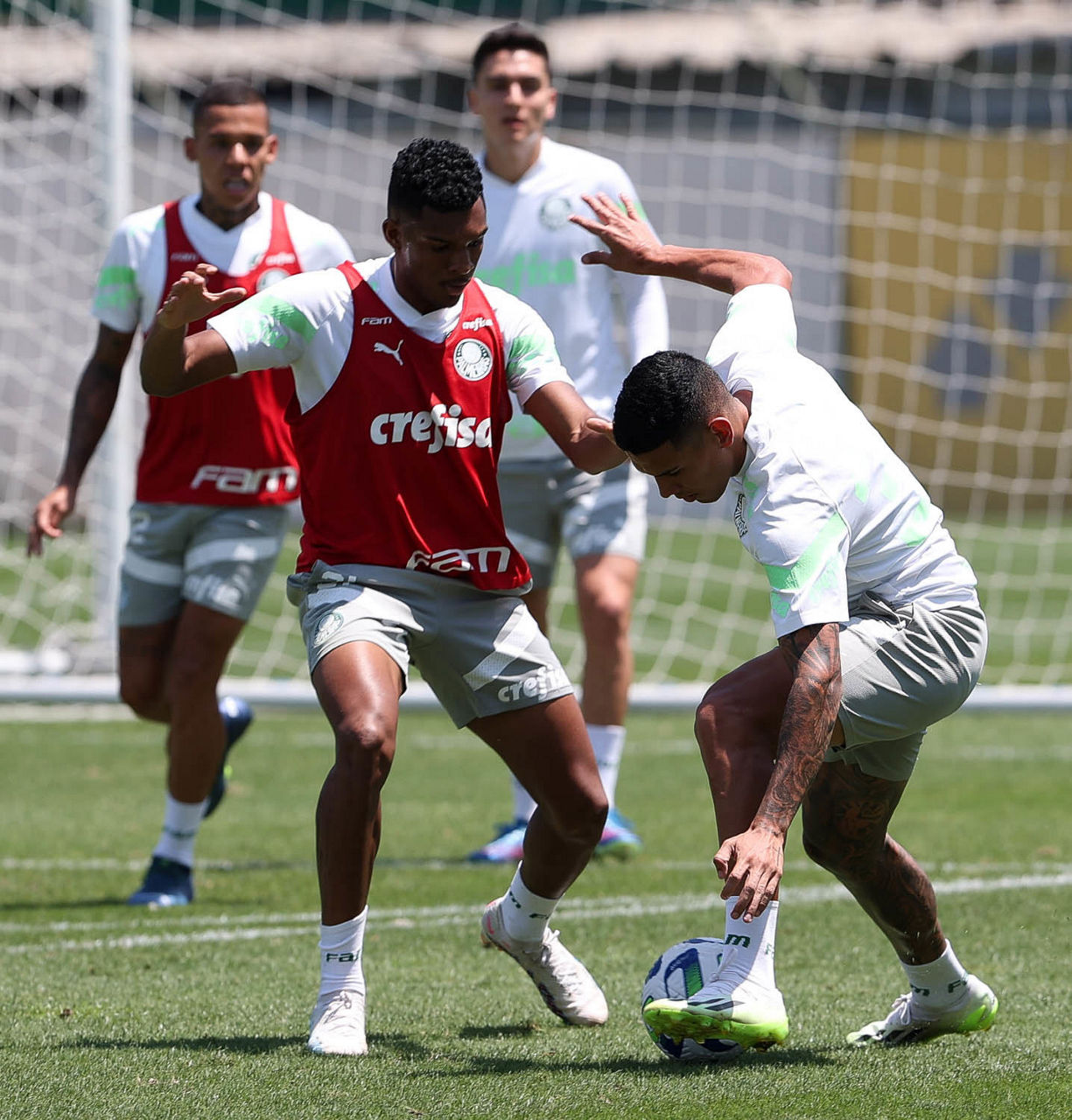 Os jogadores Eduard Atuesta (à esquerda) e Luis Guilherme durante treinamento na Academia de Futebol (Foto: Cesar Greco/Palmeiras/by Canon)