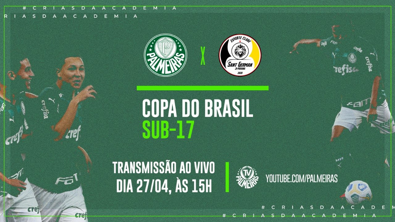 A equipe Sub-17 do Palmeiras recebe o Sant German-RO nesta quarta-feira (27), às 15h, na Academia de Futebol 2, em Guarulhos-SP, em partida única da primeira fase da Copa do Brasil da categoria. O duelo será transmitido pela TV Palmeiras/FAM no YouTube.