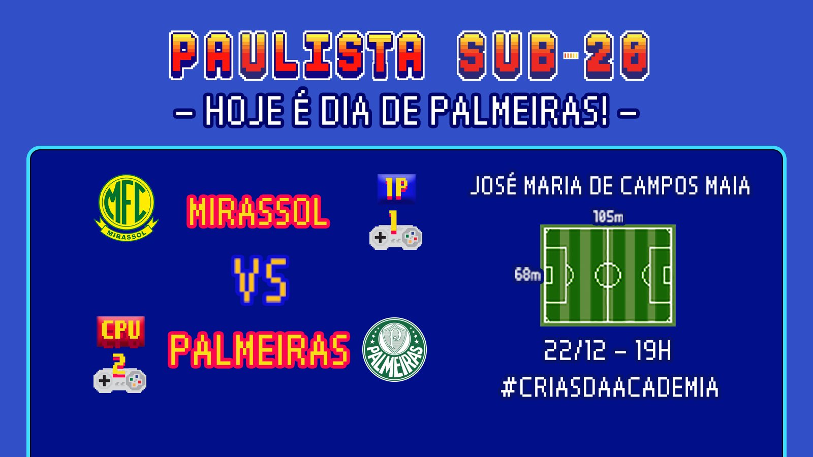 A equipe Sub-20 do Palmeiras decide o título do Campeonato Paulista da categoria nesta quarta-feira (22), às 19h, contra o Mirassol, no estádio José Maria de Campos Maia, em Mirassol-SP. A partida será exibida pela FPF TV nas plataformas Eleven Sports, Paulistão Play e YouTube.