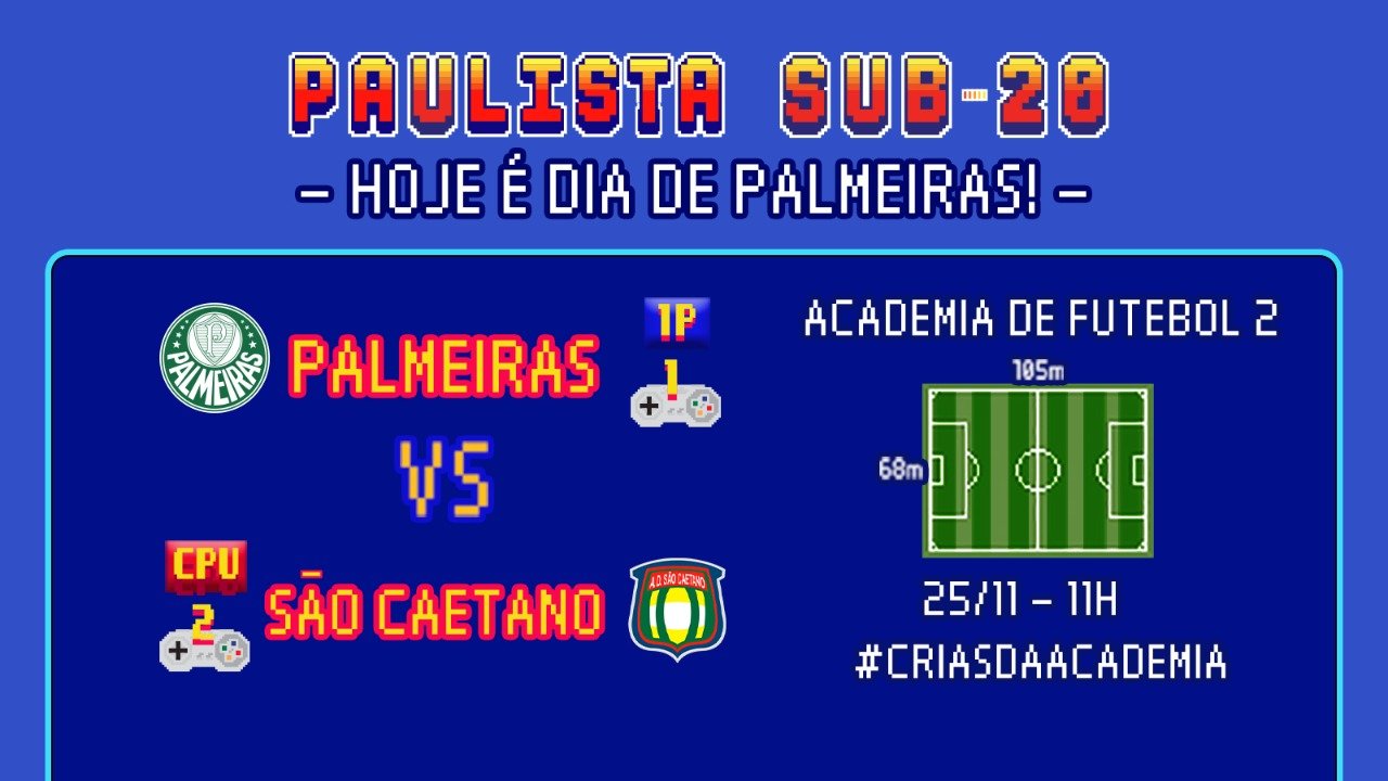 A equipe Sub-20 do Palmeiras encara o São Caetano nesta quinta-feira (25), às 11h, na Academia de Futebol 2, em Guarulhos-SP, no duelo de volta válido pelas oitavas de final do Campeonato Paulista da categoria. A partida será exibida por Eleven Sports, Paulistão Play e YouTube.